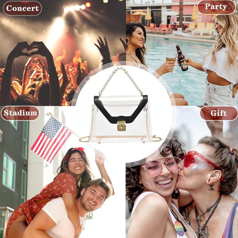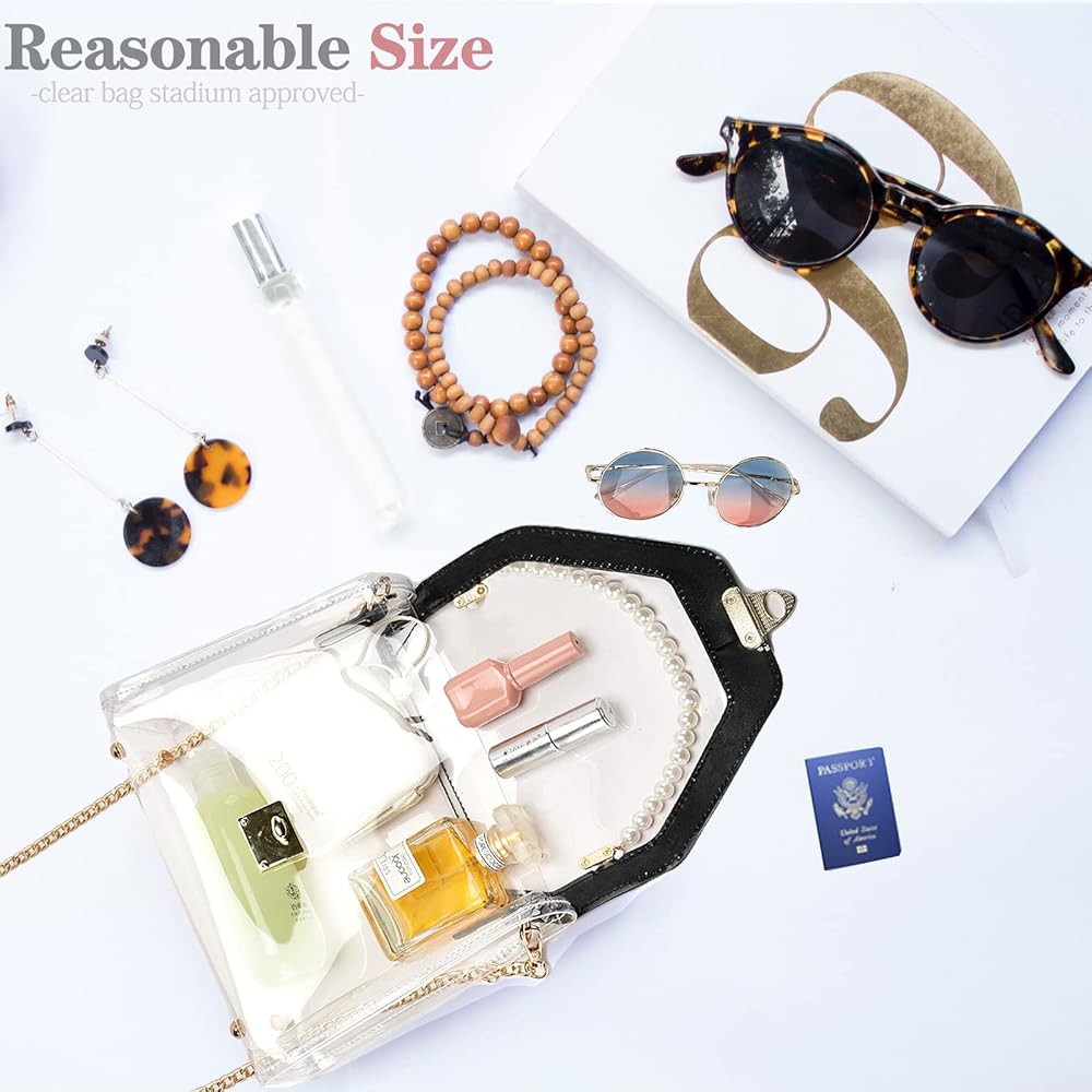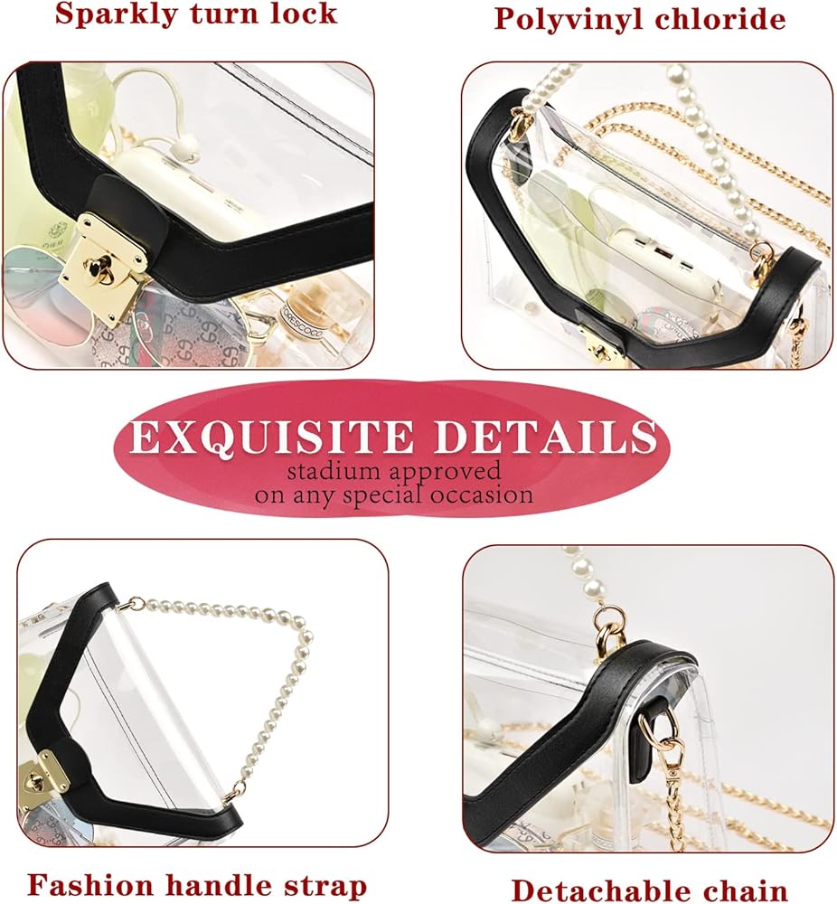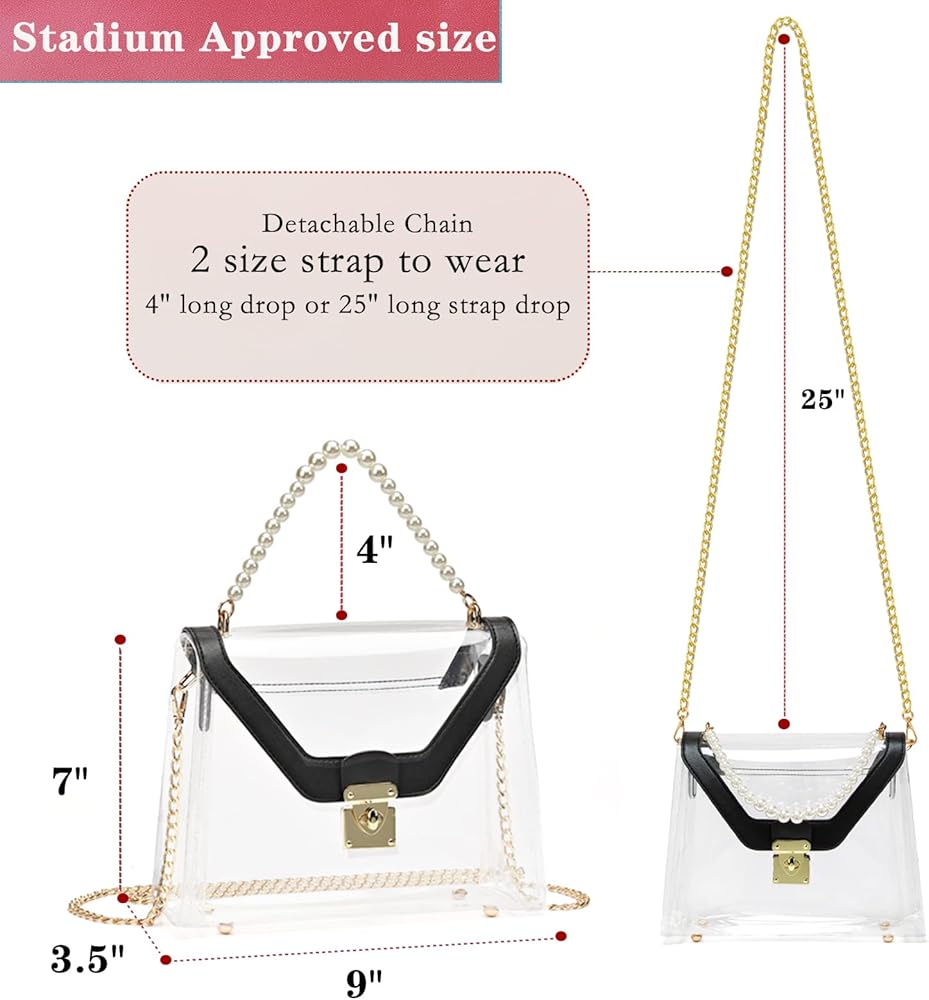 Removable & Adjustable Long Chain: The chain strap of stadium approved clear bags for women is detachable and adjustable, total length of golden strap is 50 inches, add 4 inches Imitation of pearl skewers strap can be used as a small handbag/crossbody bag/shoulder bag/handbag.