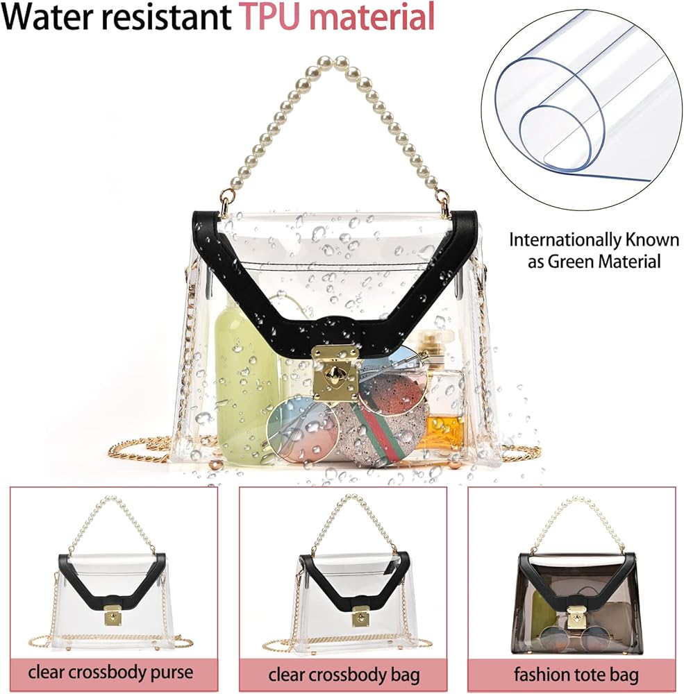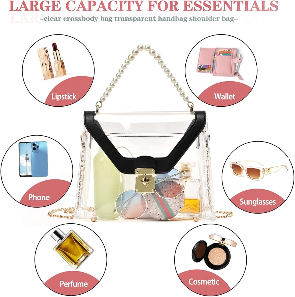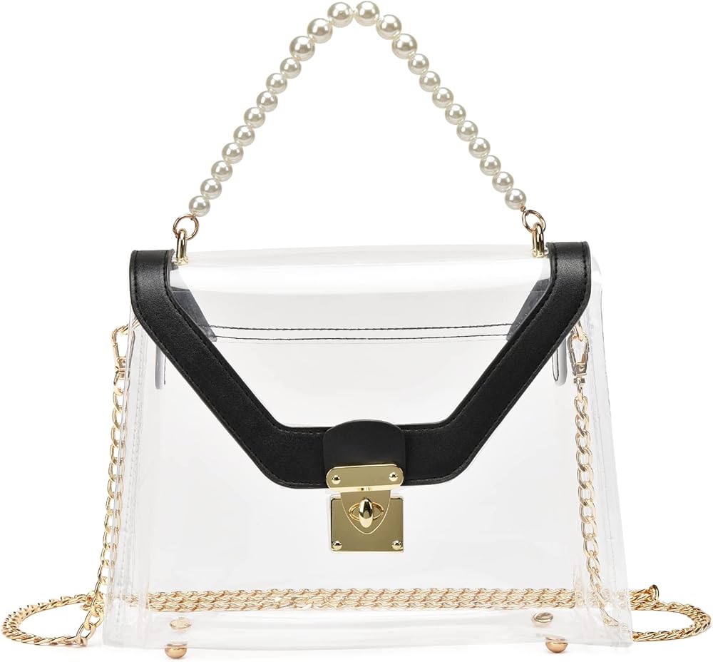 Removable & Adjustable Long Chain: The chain strap of stadium approved clear bags for women is detachable and adjustable, total length of golden strap is 50 inches, add 4 inches Imitation of pearl skewers strap can be used as a small handbag/crossbody bag/shoulder bag/handbag.