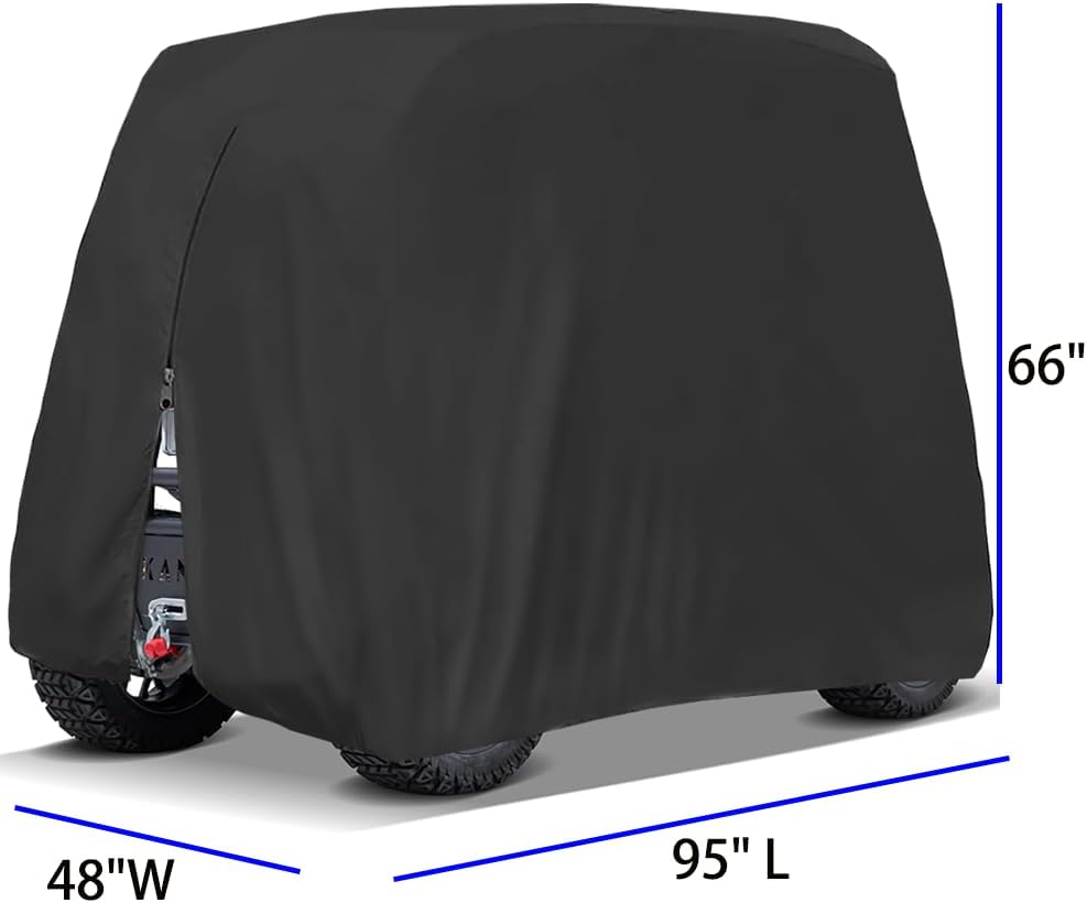 【Universal Fit】:95" Lx48 Wx66 H Inches, the 2 passenger golf cart cover fits all standard 2 passenger, suitable for EZGO, Club car, YAMAHA golf carts etc.