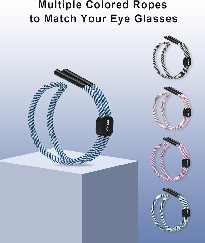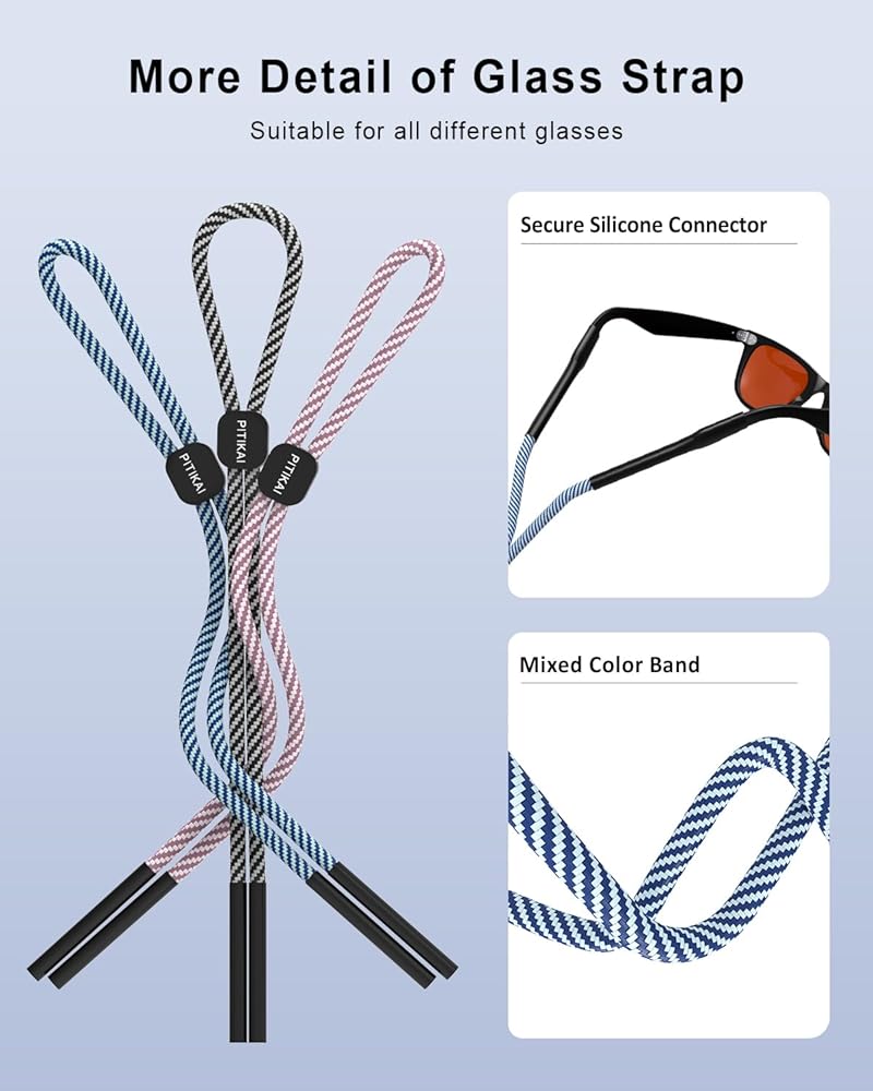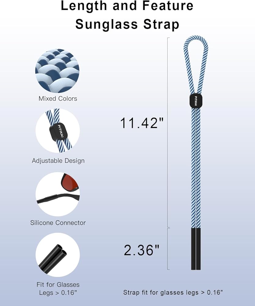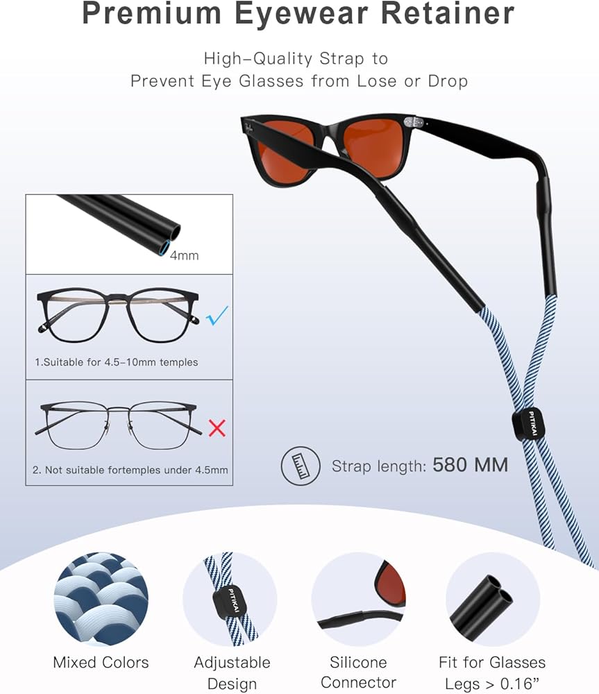 Safe and Handy: These glass straps are designed for people who often forget or lose their glasses, each sunglasses strap is 22.84 inches with a plastic slider fastener that can be adjusted to fit your head when used, simply hang the eyeglass lanyard around your neck when not using your glasses. This way, you never have to search for glasses again