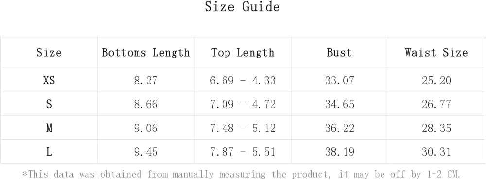 XS:Bust:33.1IN,Top Length:6.7/4.3IN,Bottoms Length:8.3IN,Waist Size:25.2IN