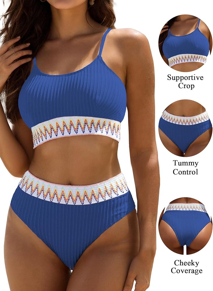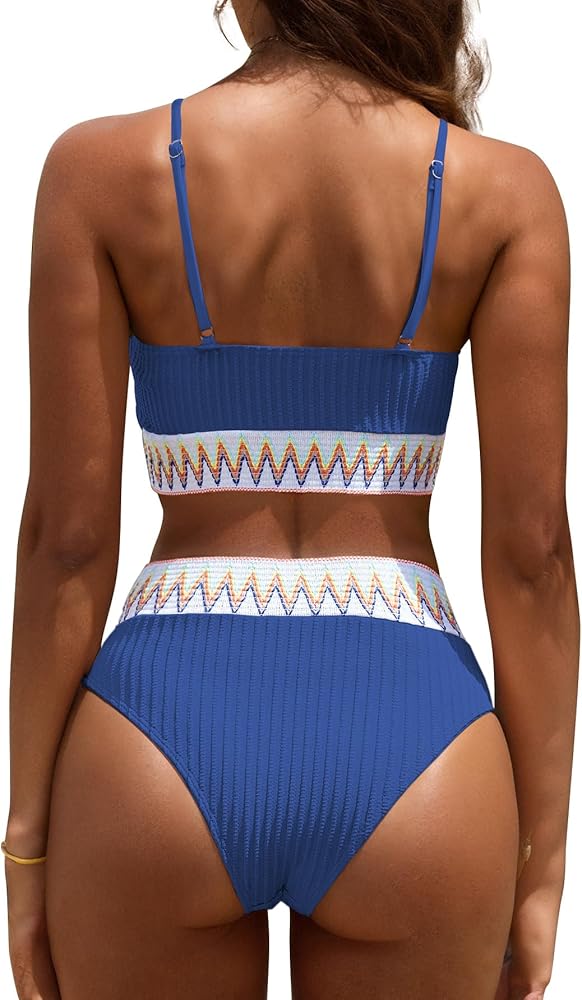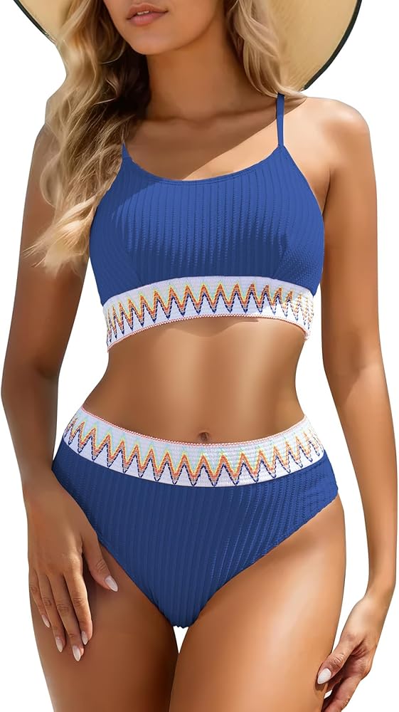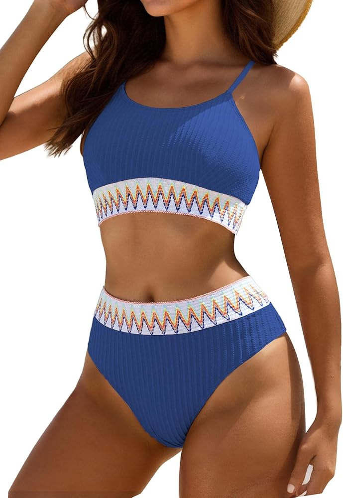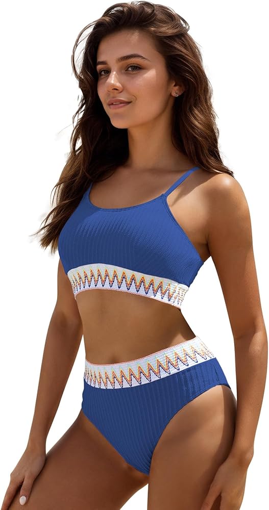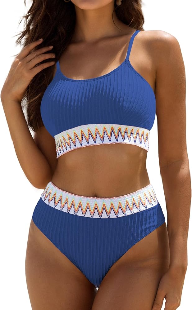Elevate your beachwear collection with this chic and comfortable high-waisted swimsuit, designed to flatter all body types. This bikini set features a trendy ribbed fabric, accented with a vibrant zigzag pattern around the waist and under the bust, offering a perfect blend of style and support.