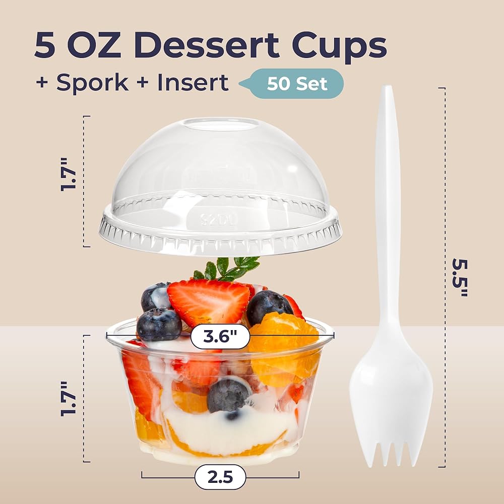 Fit Meal Prep [50 Pack] 5 oz Clear Plastic Dessert Cups with Dome Lids and Sporks, Disposable Parfait Cups with Lids, Fruits Cups No Hole, Party Containers for Yogurt, Ice Cream, Snacks, Pudding