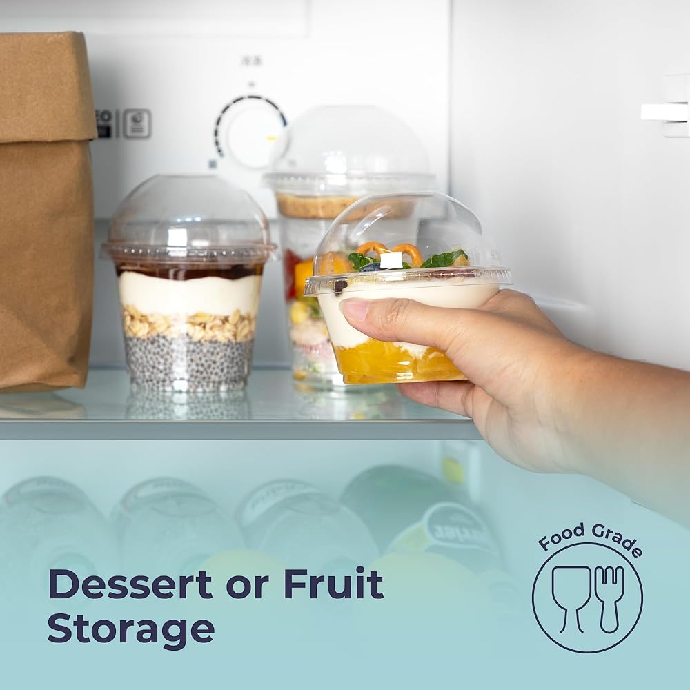 Crystal Clear Plastic Cups: These plastic cups with dome lids provide exceptional clarity to the cake or fruit inside so these cups will make your oats, fruit , iced cream, snacks, and other food more tantalizing to the eyes.