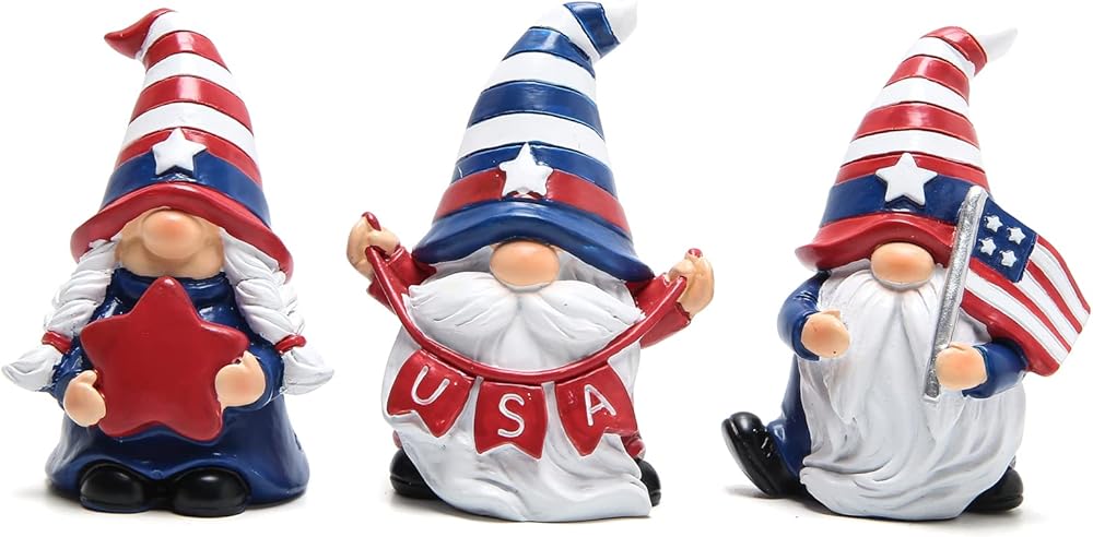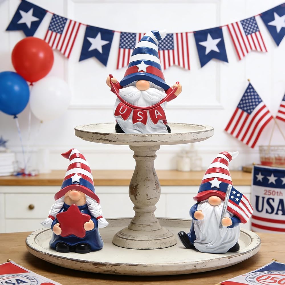 Hodao USA Semiquincentennial Patriotic Gnome Set of 3, Resin 4th of July Gnome Figurines with American Flag & USA Banner, 250th Anniversary Independence Day Decor Festive Gift for Home Indoor