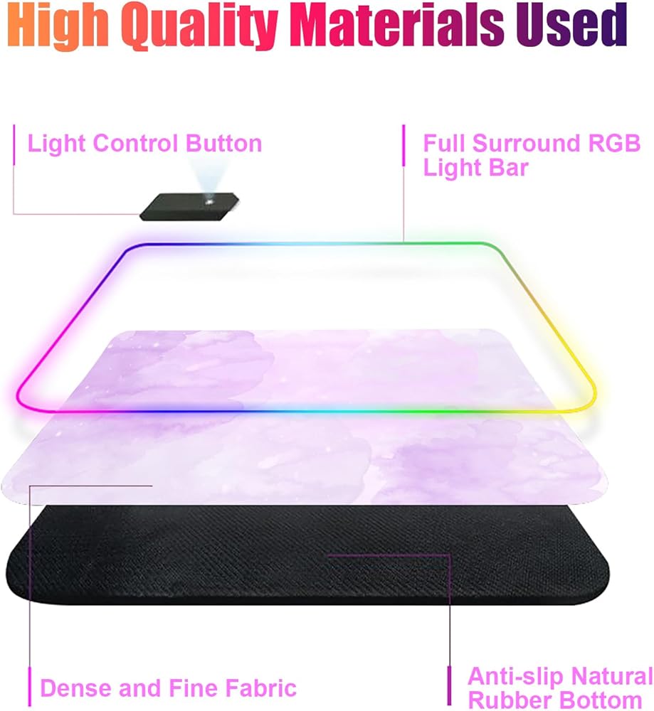 【RGB lighting】this gaming mouse Pad has 14 lighting modes. 7 static light modes, alternating Wave, synchronizing Wave, alternating flash, alternating red changing, lights off, synchronize breathing, Alternate breathing. It's not too distracting when you're playing/working.