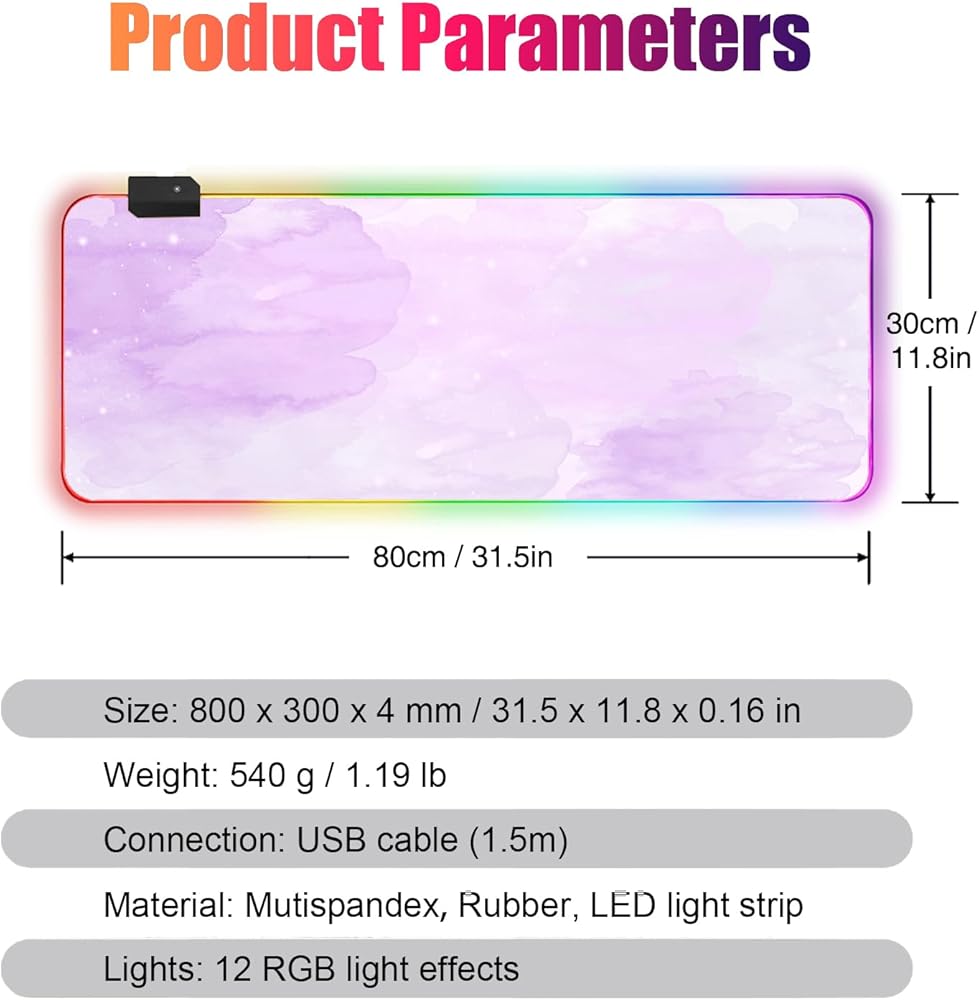 【Large size】measuring 800 x 300 mm/ 31. 5×11. 8 inches, The RGB mouse pad works with all keyboard and mouse, and still have a large amount of movement space. The thickness is 0. 2 inches, thick enough to support a wrist, which ensures your wrist's comfort.
