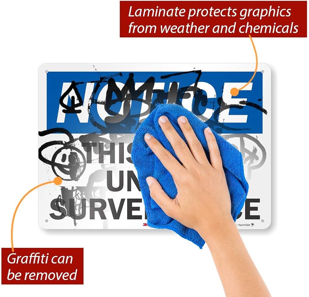 3M Engineer Grade signs have a 7-year outdoor warranty, but most signs last much longer. Our 40 mil Area Under Video Surveillance Sign is laminated for enhanced performance. You can clean off graffiti and your graphics are protected. Unlike many other signs, our Notice - This Area Under Surveillance signs use industry-leading 3M inks and not off-brand or other low-durability inkjet pigments that fade in a year or two.