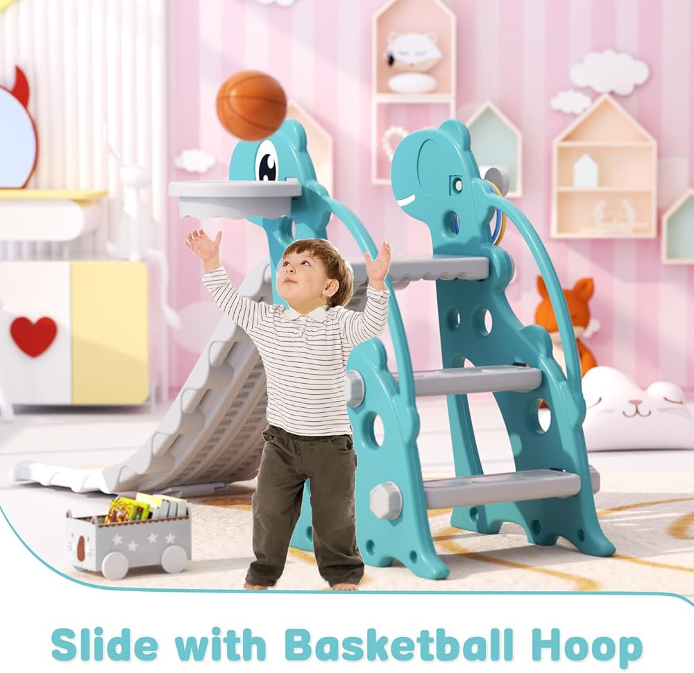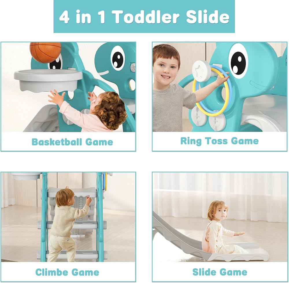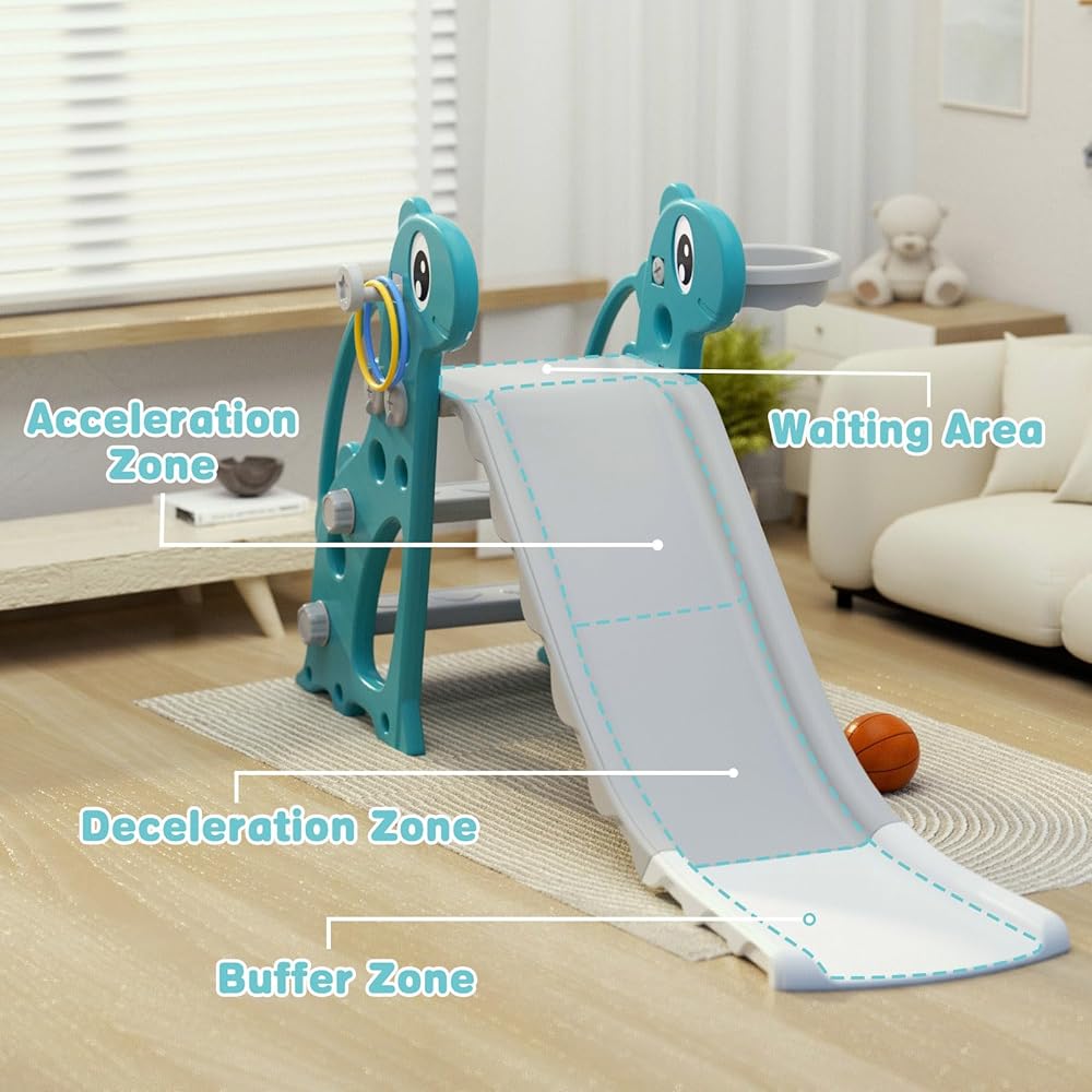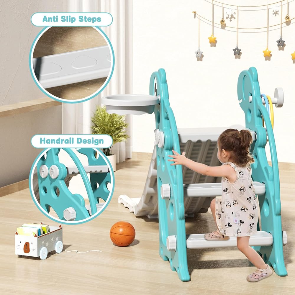 Versatile 4-in-1 Playground: Unleash your child's potential with this all-in-one playground featuring a climbing ladder, thrilling slide, interactive basketball hoop, and engaging Ring Toss game, fostering motor skills and limb coordination through diverse play experiences.