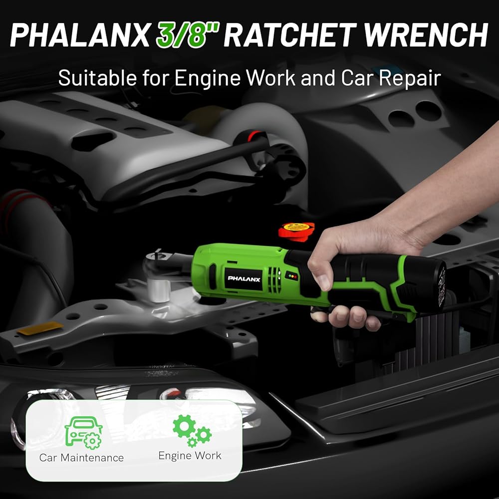 Powerful Torque Ratchet Wrench - Slow rotate speed contributes to high torque. With a max torque of 50N.m at 250 RPM and a variable speed trigger, PHALANX cordless ratchet provides a high performance for construction, auto repair, and even home repair work. The variable speed trigger meets the needs of different project items and allows you to tighten or loosen various nuts and bolts easily.
