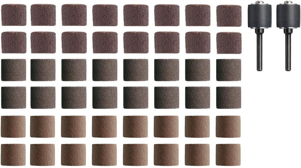 Boost your crafting and repair capabilities with the 770B-01 1/2" (12.7mm) Sanding Band Variety Kit, featuring 48 versatile sanding bands in three distinct grit levels. This comprehensive set is an economical way to ensure you're prepared for diverse tasks, making it ideal for both seasoned craftsmen and hobbyists. Each band is designed to fit all Dremel rotary tools seamlessly. Experience the benefits of different grits: coarser bands swiftly strip and shape materials, while finer bands achieve smooth, polished finishes. These bands are effective on materials like hardwood, softwood, plastic, and aluminum, and are robust enough for tasks such as rust removal from steel and shaping rubber.Kit Includes:• 2 x 470 1/2 In. (12.7mm) sanding mandrels with 60 grit, for aggressive material removal.• 14 x 408 1/2 In. (12.7mm) 60 grit sanding bands, tailored for quick debris and finish removal.• 16 x 432 1/2 In. (12.7mm) 120 grit sanding bands, ideal for pre-finishing wood or cleaning surfaces.• 16 x 445 1/2 In. (12.7mm) 240 grit sanding bands, excellent for fine sanding and detailed touch-ups on wood or varnish.Each sanding band is easily replaceable and can be swiftly swapped using the 430 Sanding Drum Mandrel, facilitating smooth transitions across different project stages. This set not only broadens the capabilities of your Dremel tool but also supplies you with a variety of grits to tackle any project with confidence.
