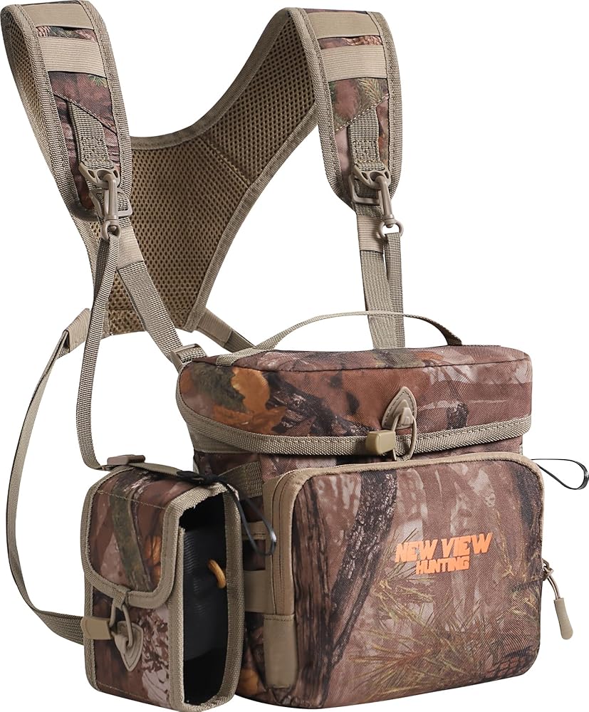 Bino Harness. The binocular harness chest pack is designed with an adjustable strap for a customized fit. The straps are breathable and crafted for all-weather use, ensuring comfort during extended hunting sessions. This hunting bino harness also features dual MOLLE straps on each side of the chest pack, providing secure attachment points for small hunting tools and accessories, making it an essential part of your bino pack for hunting gear