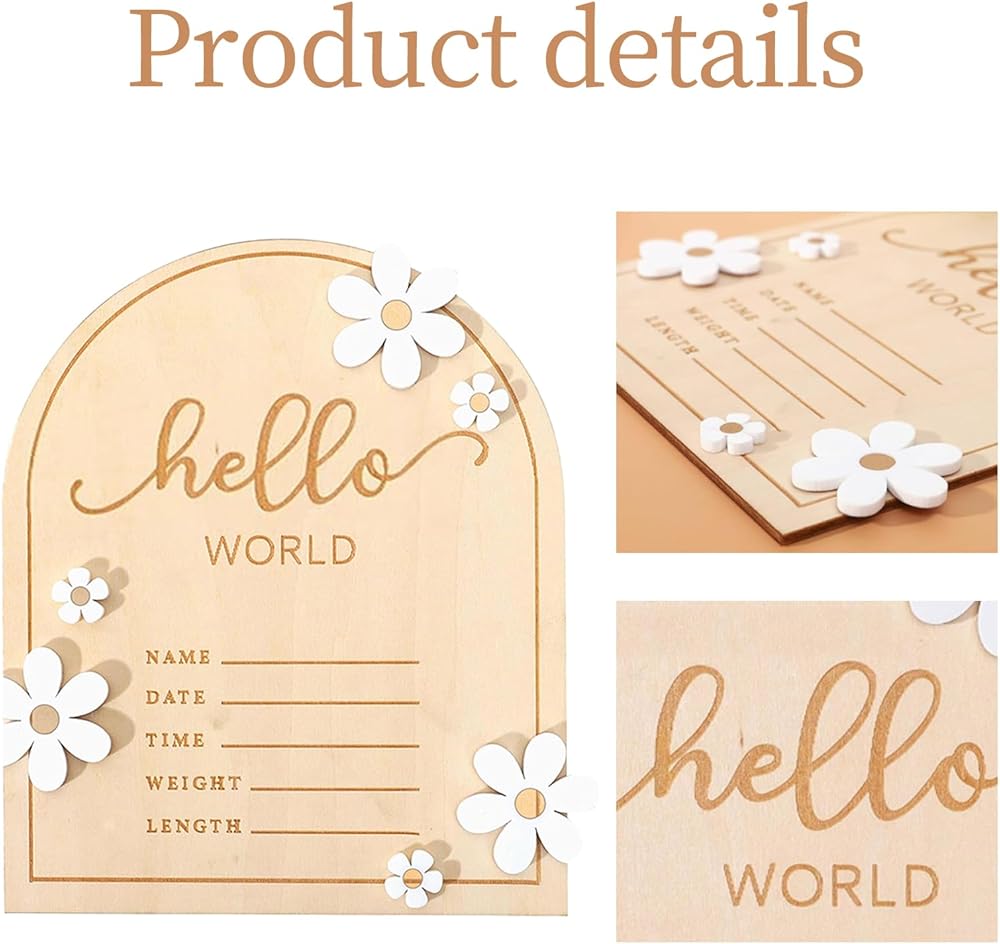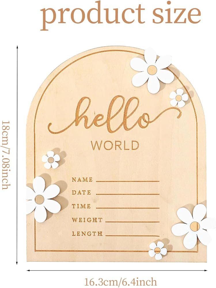 Package Contents: You'll receive a delightful newborn sign featuring a 3D white flower and the engraved phrase "Hello World." Additionally, it includes birth statistics on a wood base.