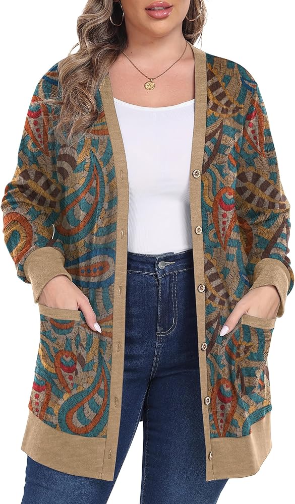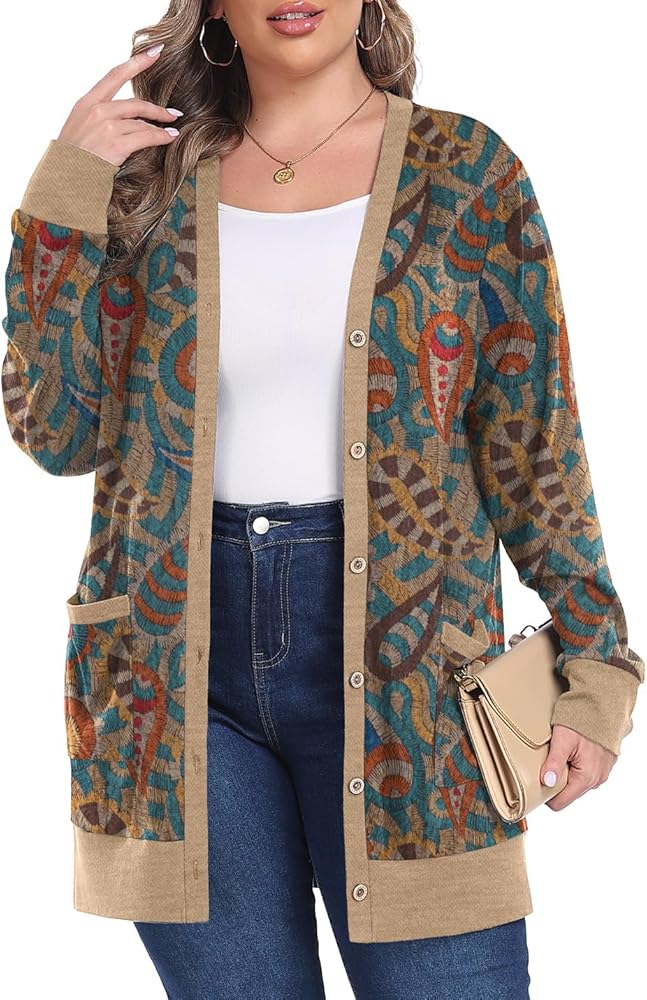 Unique Design: This plus size sweaters for curvy women features long sleeves, available in solid or printed designs, a classic V-neckline, 6 buttons, 2 large pockets, and a length that falls below the hips. It can be worn as a plus size sweater jacket, offering a loose fit that ensures comfort and freedom of movement