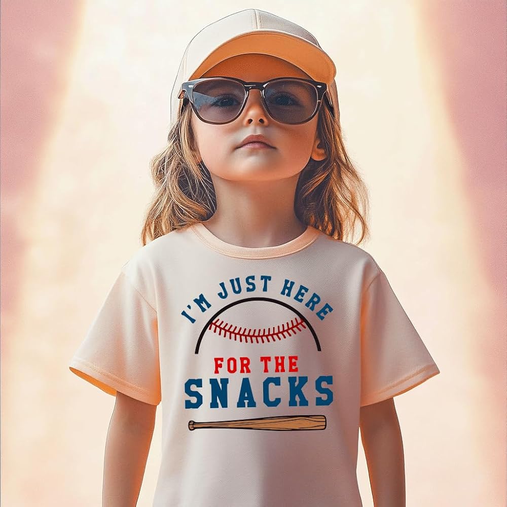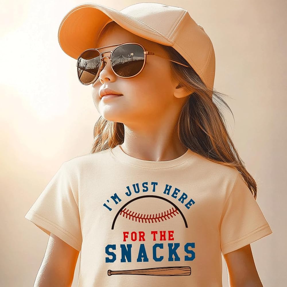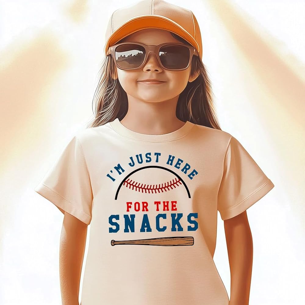 Design: Featuring a classic crewneck and short sleeves, our toddler baseball tee is adorned with a charming baseball graphic and the humorous phrase "I'M JUST HERE FOR THE SNACKS". This unisex design is perfect for both boys and girls, adding a playful touch to their wardrobe.
