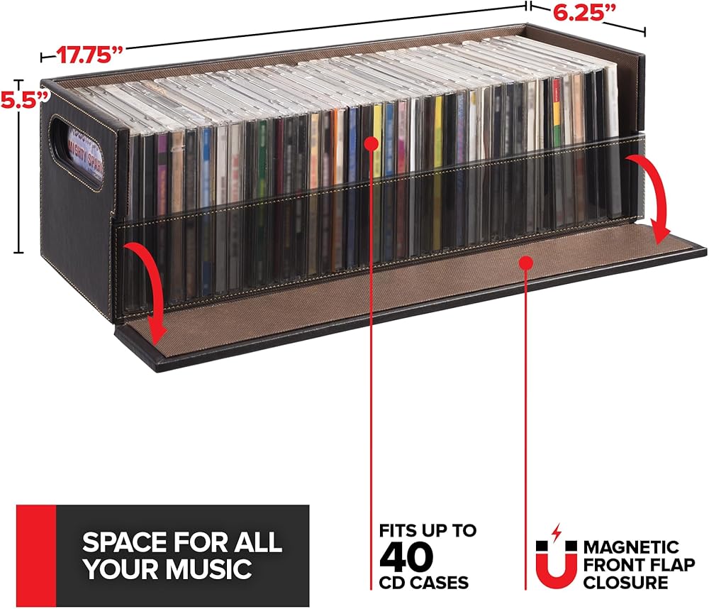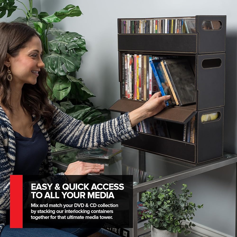 Sophisticated CD & DVD Storage: Our shelves are a chic and stylish way to organize your DVDs & CDs. Made with a smooth, faux leather exterior and a corrugated felt interior, our organizers compliment any home décor.