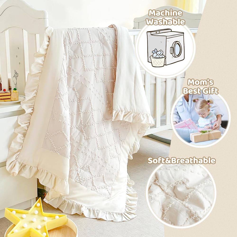 Ruffle Bedding Theme: The baby bedding crib sets girl boy features cute ruffle comforter set for crib in beige. It creates a dreamy and happy bedroom, bringing more color and warmth. You will find your baby getting a restful sleep