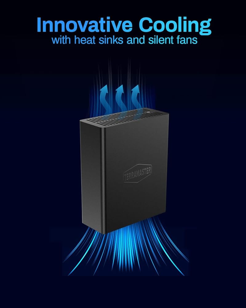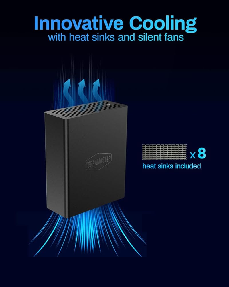 Whisper-Quiet Performance for a Peaceful Environment: The F8 SSD Plus network attached storage offers top-tier performance with minimal noise, thanks to its SSD-based storage. Its advanced cooling system, featuring convection design and heat sinks on each SSD, keeps temperatures low while silent fans ensure quiet operation. Even under heavy use, the F8 SSD PLUS remains nearly silent, with standby noise levels below 19dB. Compact and unobtrusive, it seamlessly fits into any home, delivering an ultra-quiet experience.