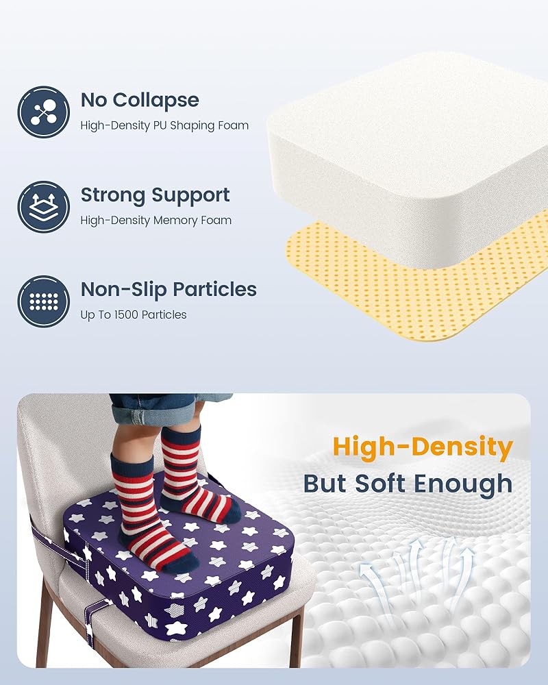 EASY TO CLEAN: The cloth cover of the booster seat is not only wear-resistant and stain-resistant, not easy to fade, but can also be disassembled for cleaning. If food accidentally falls on the booster seat cushion, you can just wipe it with a damp paper towel to clean it. The detachable design makes it easy for you to clean at any time. The booster seat cover can be machine washed or hand washed. But the sponge does not need to be washed