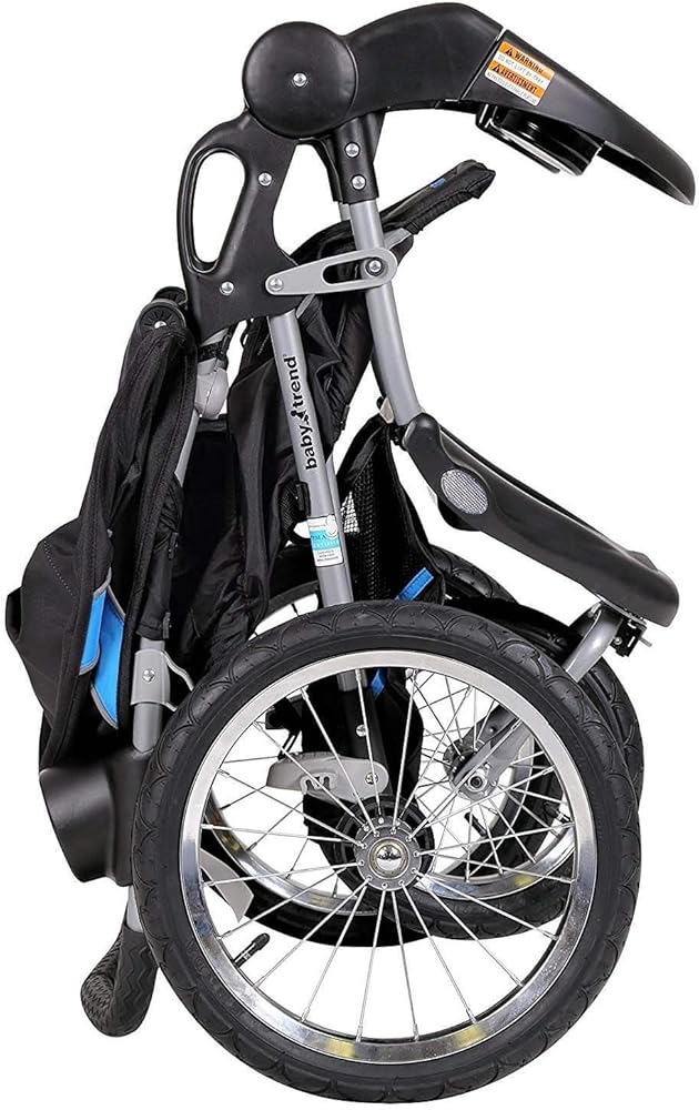 Get around in comfortable style with the Baby Trend XCEL R8 Jogging Stroller. Designed with safety features and ease-of-use functions, the stroller provides a smooth ride for you and your little one, no matter where the destination. The all-terrain jogger allows for hassle-free travel due to its lightweight frame and easy trigger fold. Equipped with an adjustable canopy and peek-a-boo window, it also boasts an extra-large storage basket for essential travel items, a deluxe parent console with two cup holders and covered storage and a swing-away child's tray for drinks and snacks. Additional highlights of the Baby Trend jogging stroller include an extra-wide rubber handle and a multiple position reclining seat with an adjustable five-point safety harness and tether strap. The dual foot rest reflectors provide enhanced low-light visibility.