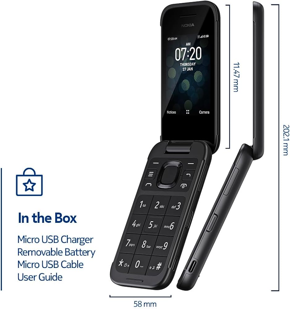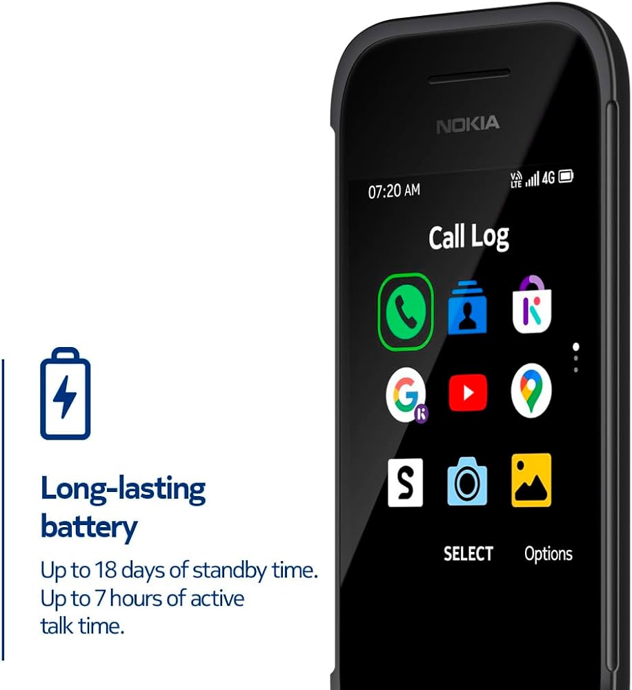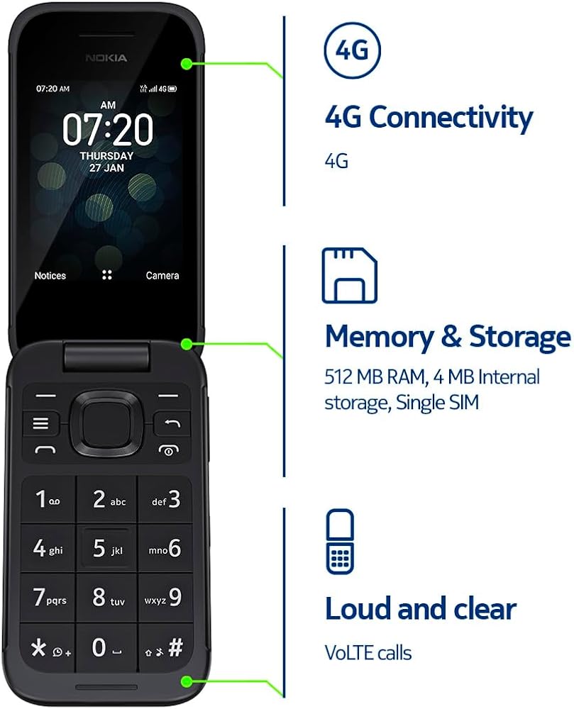 With its simple, easy to use interface, and with the modern features you need, the Nokia 2780 Flip phone is a modern twist on the classic flip now with 4G. With its intuitive design it already feels familiar. It comes with two large screens, to make texting easy and seeing who's calling even easier. Rigorously crafted to our high durability standards, this is a phone that's designed to outlast the bumps and knocks of everyday use. Accessibility features on Nokia 2780 Flip include big buttons, hearing aid compatibility and real-time text (RTT) to ensure this is a phone for everyone and the dedicated side button can be programmed to quickly dial a loved one in case of emergency. FM radio and 3.5mm audio jack so you can listen to music wherever you go. Enjoy up to 18 days of standby time from a single charge. Even if you only use your phone once a month, it's ready when you are. And the 7 hours of talk time, ensures that you stay connected with friends and family for longer. Use your favorite apps and even browse the internet – all on 4G. VoLTE 4G means all your voice calls will be clearer and in HD quality. Plus, the Nokia 2780 Flip comes with a loudspeaker and adjustable volume as well as a 5 MP rear-camera. Video recording and playback is also included, for when you want to capture those longer memories.