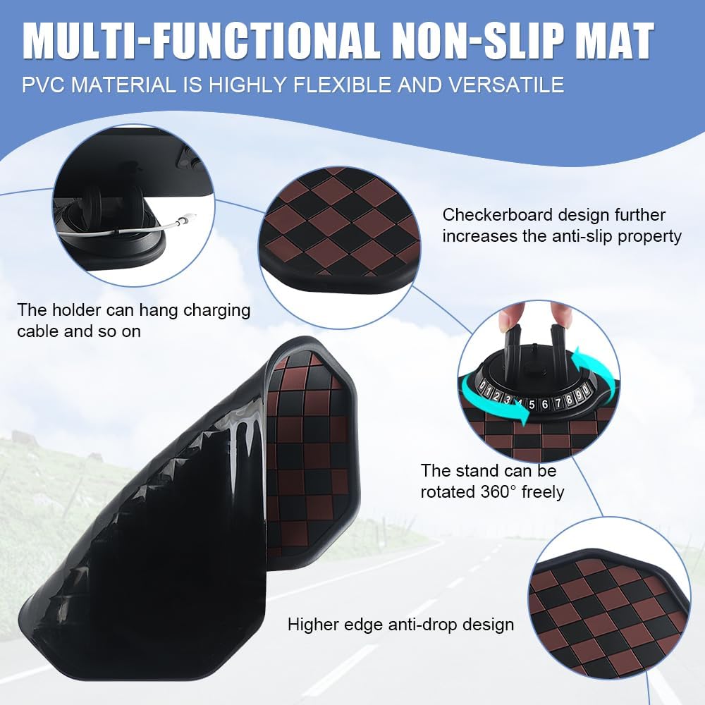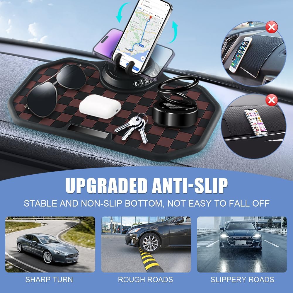 Car Anti Slip Mat Dashboard Tray Decorations Sticky Pad Multi Functional Thickened and Widened Washable with 360° Rotating Universal Phone Pad Holder+Number Plate(Black&Brown)