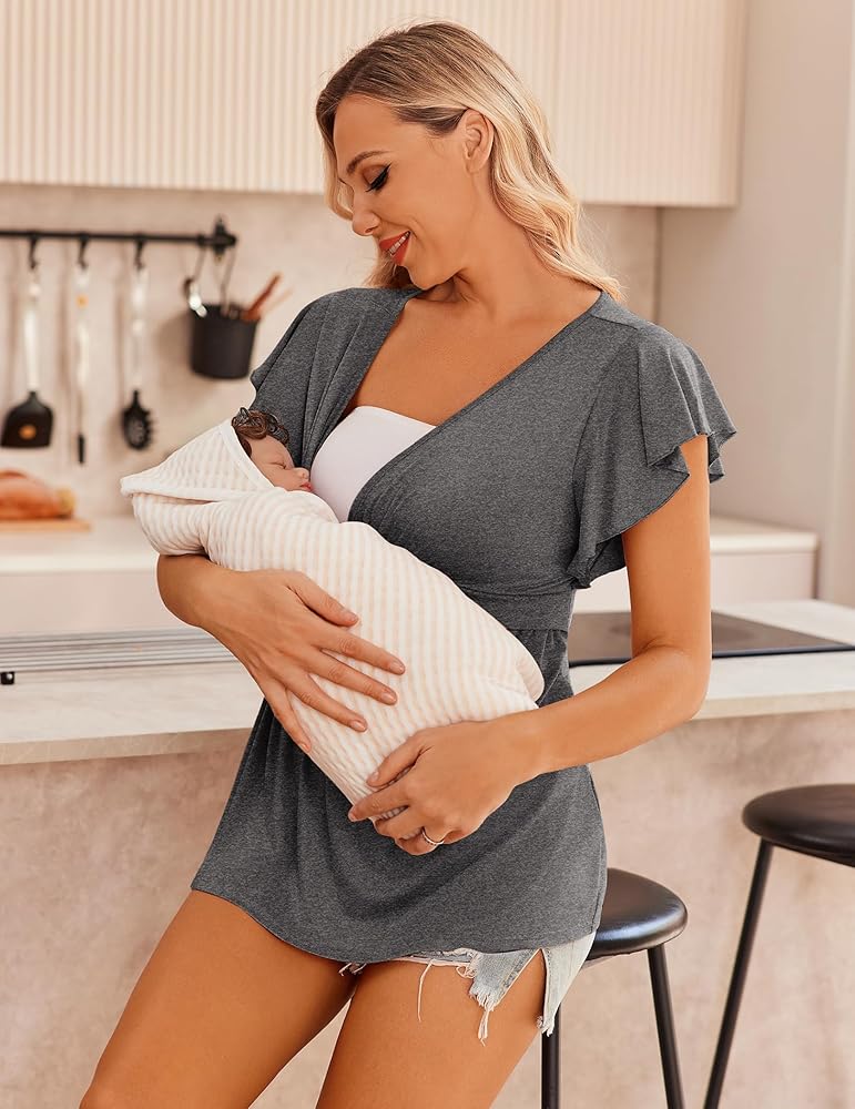 【Design】Stylish flying short sleeve, v neck pull-down nursing access, empire waist, flowing hemline, stylish t-shirt. Middle empire waist belt and flowing hemline make you looks more stylish, it also has a lot of room for your baby bump belly. These casual maternity nursing tops are a style staple for mom-to-be.