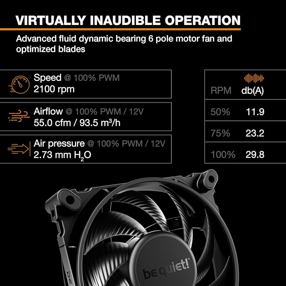 The Silent Wings 4 120mm PWM fan features an advanced fluid-dynamic bearing, smooth 6-pole motor and airflow-optimized fan blades. Thanks to a tight tip clearance between fan blade and frame, the front fan provides extremely high air pressure. A funnel-shaped frame outlet enables ideal air distribution. The rubberized fan frame prevents vibrations from transferring to the heat sink, reducing overall noise.