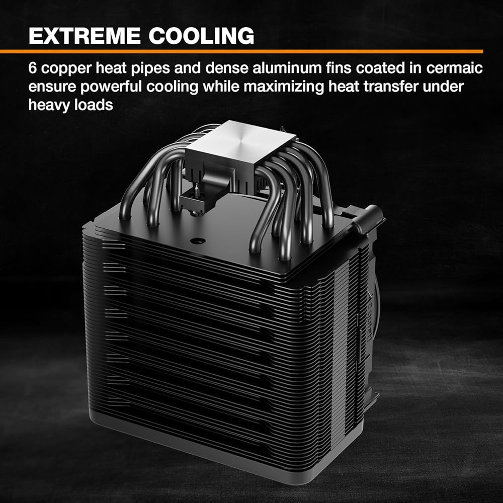 With 6 high-performance copper heat pipes and a dense aluminum fin array, Dark Rock 5 offers robust cooling. A special black coating with ceramic particles enables perfect heat transfer from the heat sink to the air, keeping your system cool under the most intense workloads.