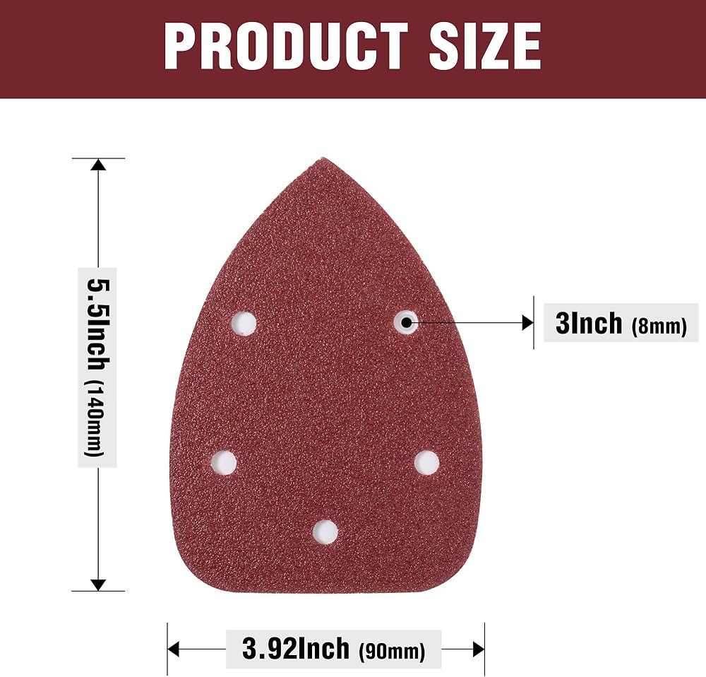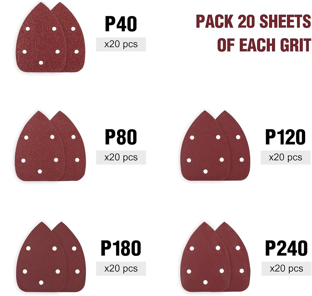Package: 100 Pcs mouse sander sandpaper ( Assorted 40/80/120/180/240 Grits), 5 holes design.