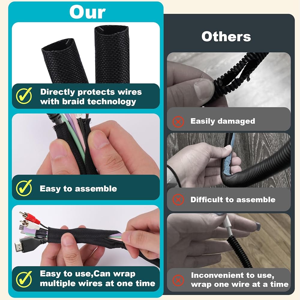 ①Easy To Use - Open design cord protector from pet allow for easy to use.The lightly coiled, wrapper-style cable cover easily slips over charging cables, power cords and more for a just right fit without a fuss. The flexible 13 foot tube can be cut to fit exactly the length you need.