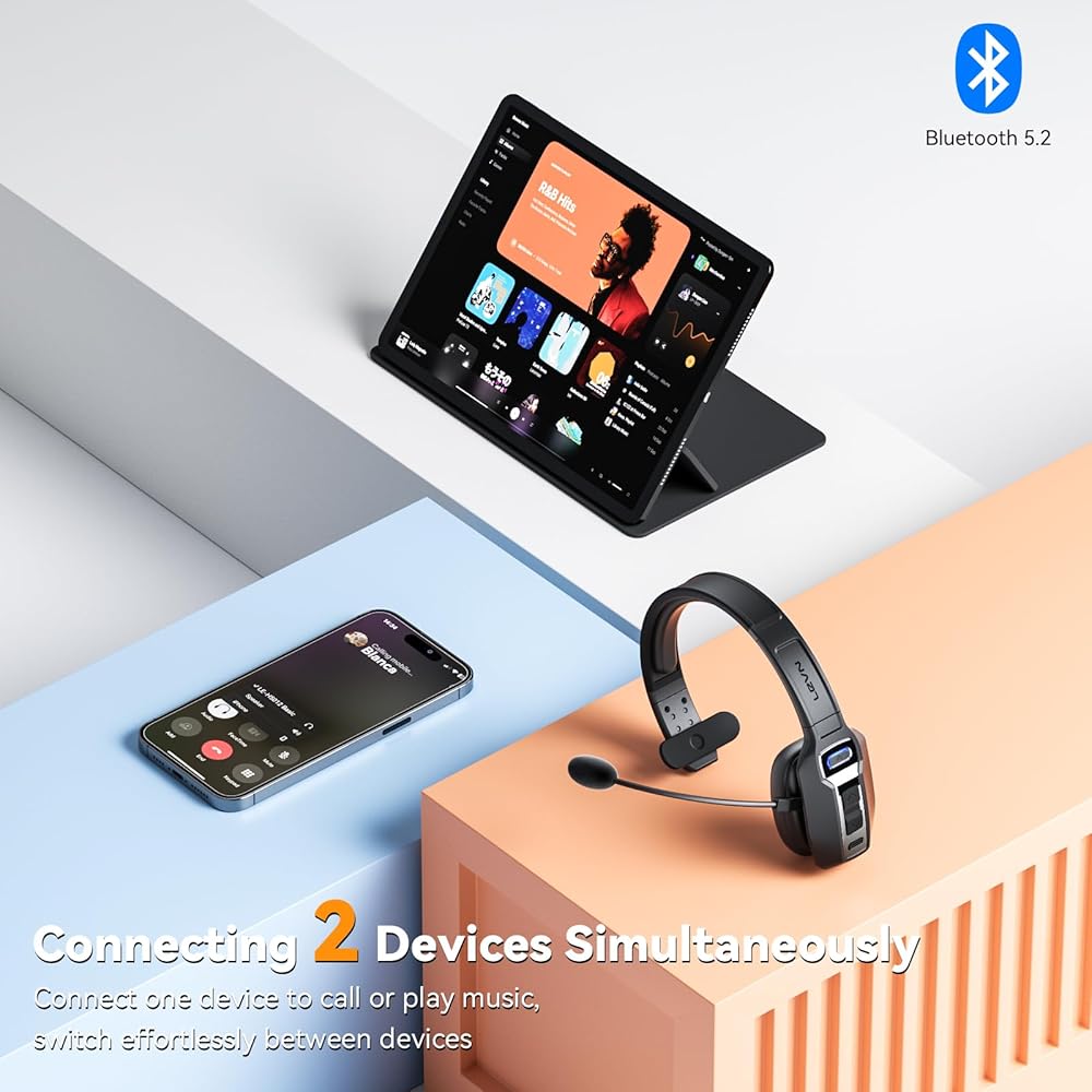 LEVN Bluetooth V5.2 Headset, Trucker Bluetooth Headset with AI Noise Cancelling Mic, 65-Hour Battery, Connect 2 Devices, Trucker Headset for Trucker, Remote Work, Online Meeting and Business Travel