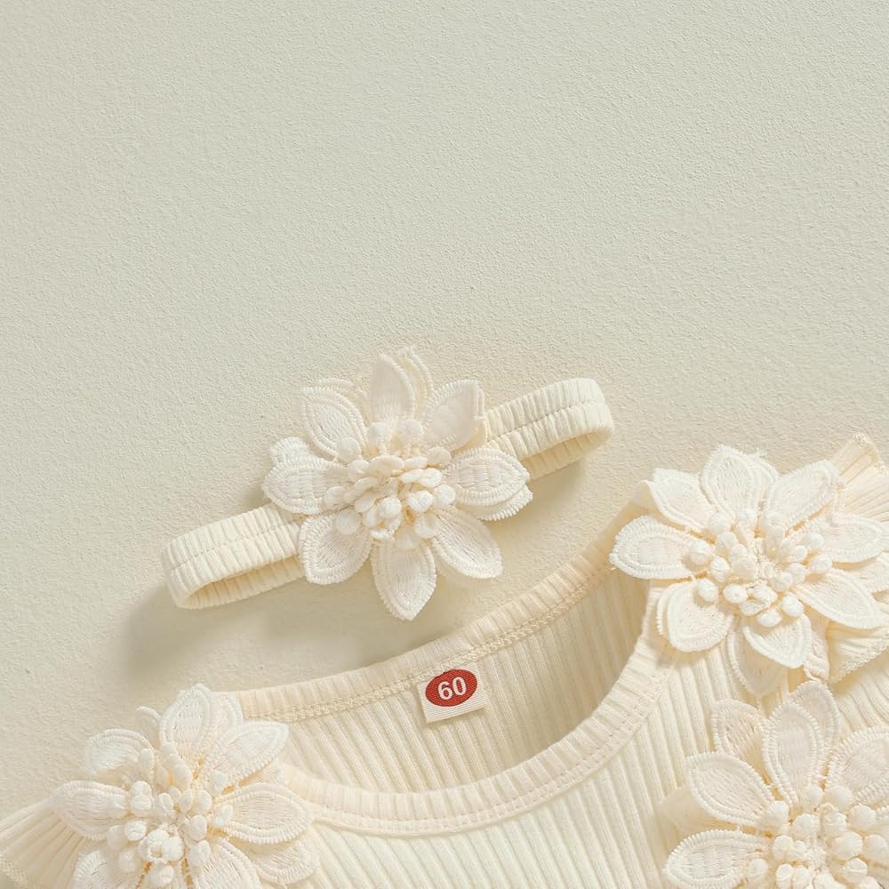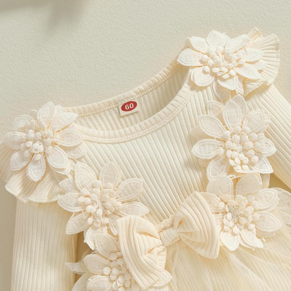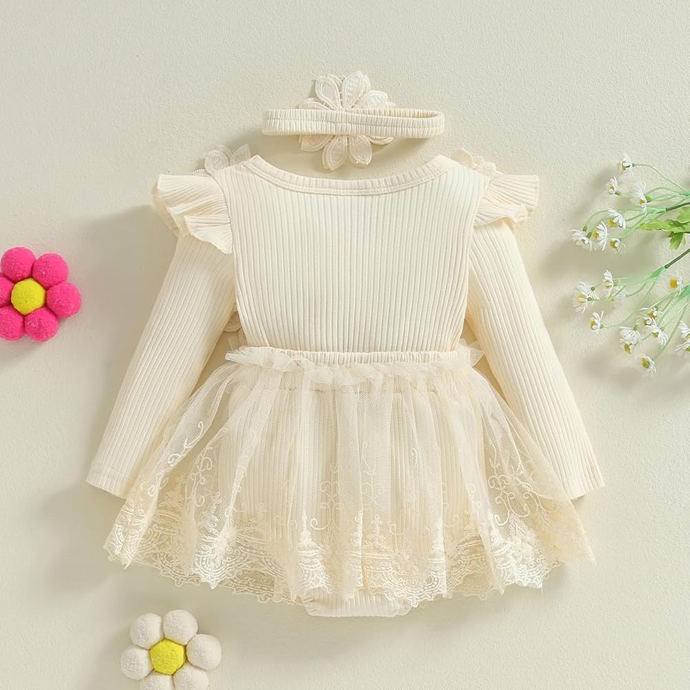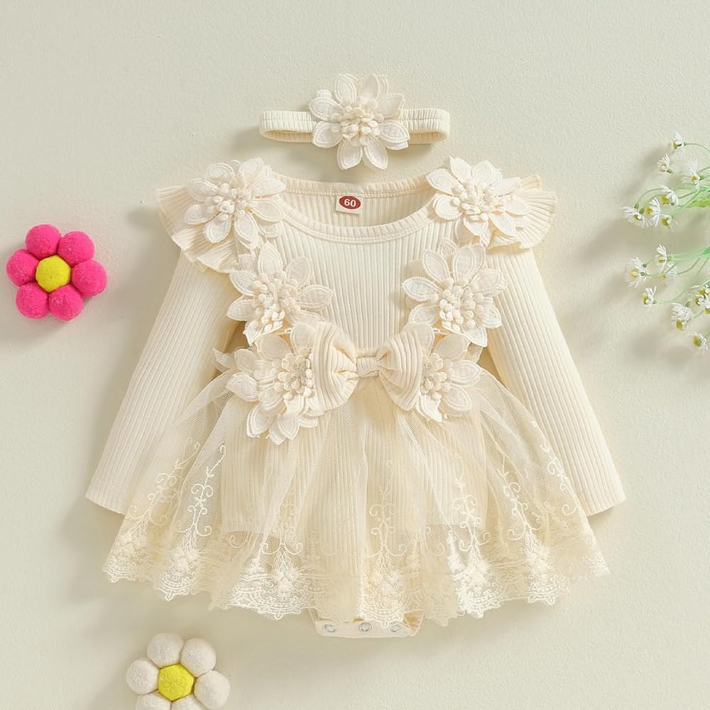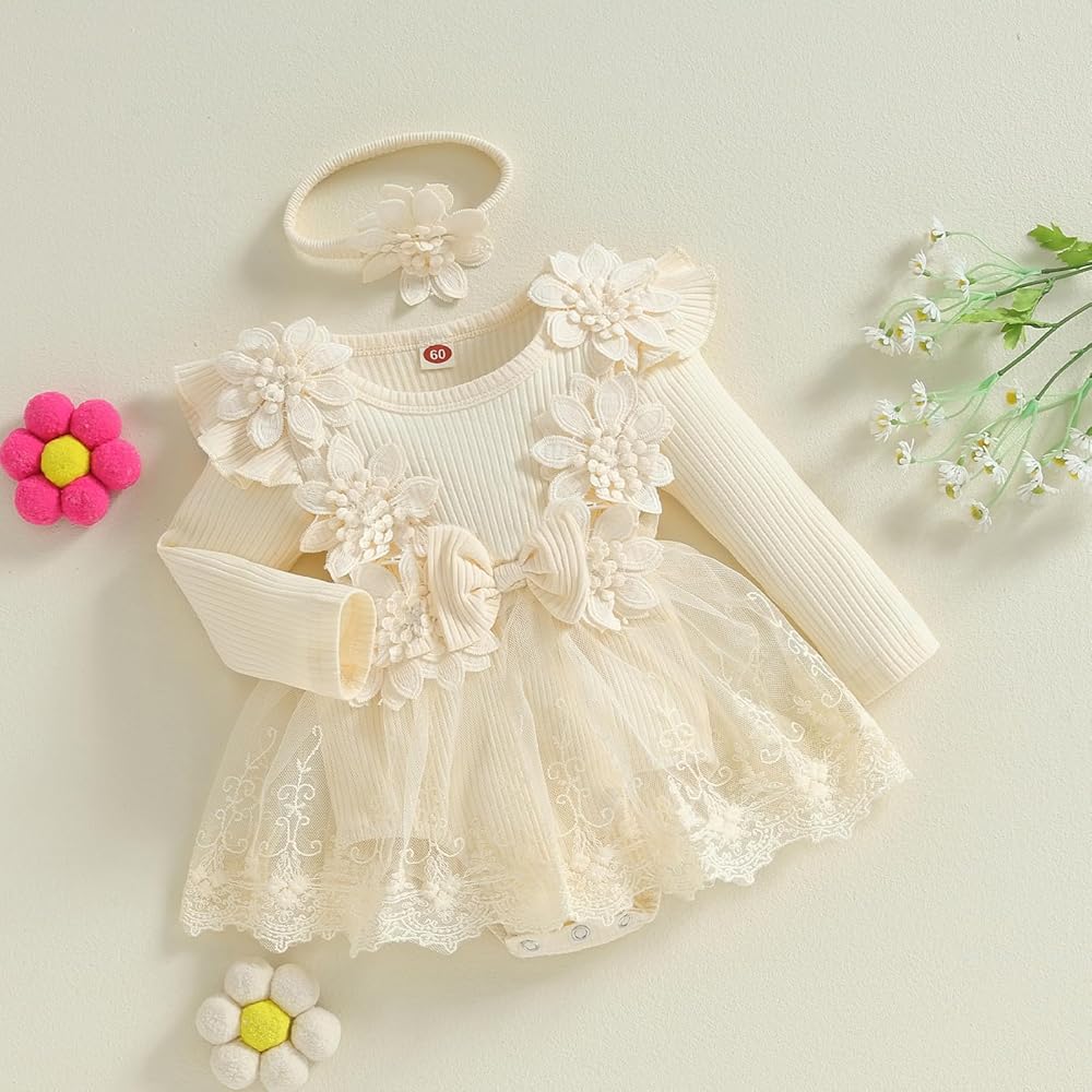 Infant Baby Girl Romper Dress Baby Dress Romper Flowers Lace Fall Winter Festival Clothes with Headband
