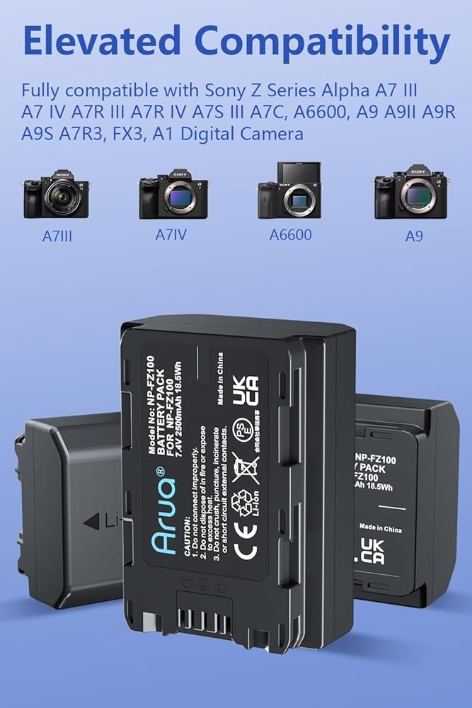 بطارية Arua 3 عبوات NP-FZ100 بقدرة 2500 مللي أمبير في الساعة مع شاحن LCD ثلاثي الفتحات متوافق مع كاميرا Sony Alpha A7 III A7R III A9 Alpha 9 A7R3 A6600 A7R IV Alpha A9 II Alpha 9R A9R Alpha 9S