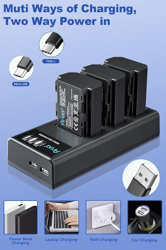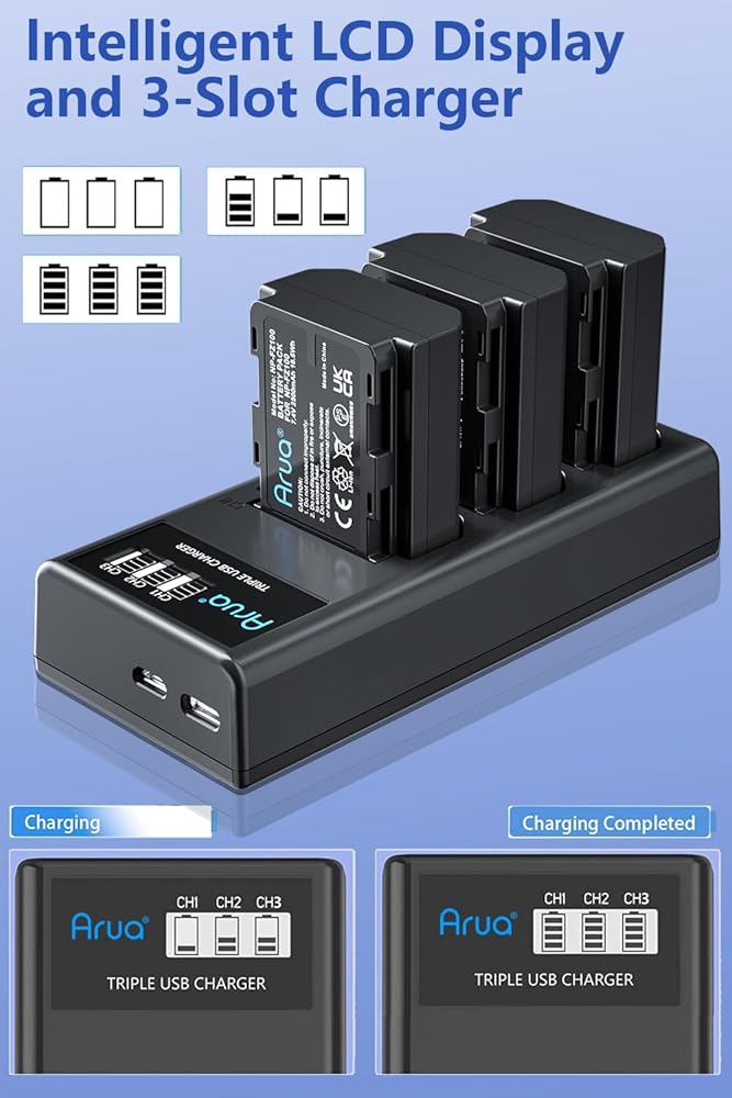 Triple Slot LCD Charger:Arua Triple slot charger can charge 3 batteries simultaneously. An intelligent LCD display np-fz100 charger clearly shows the battery capacity, allowing you to quickly judge the battery status so that your work will not be interrupted
