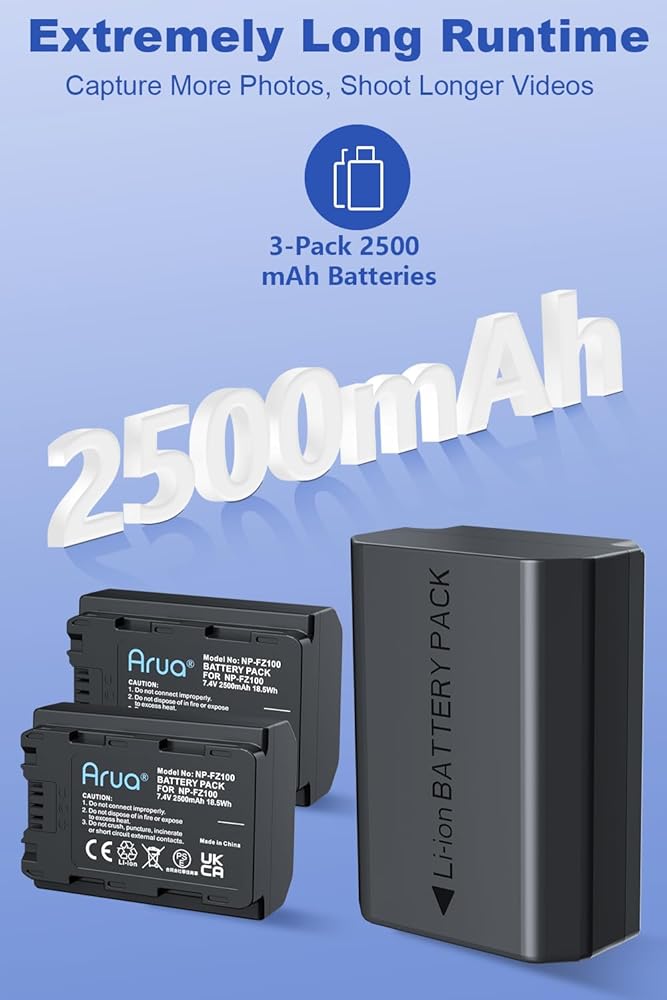 سعة كبيرة جدًا: يمكن لبطاريات Arua np-fz100 المكونة من 3 عبوات سعة 2500 مللي أمبير في الساعة المشحونة بالكامل أن توفر الكاميرا الخاصة بك لفترة أطول تصل إلى 4 مرات، مما سيجعل جودة التصوير أفضل. يمكن لبطارية واحدة التقاط 2011 صورة متتالية (تأخير 3 ثوانٍ، فجوة 3 ثوانٍ)