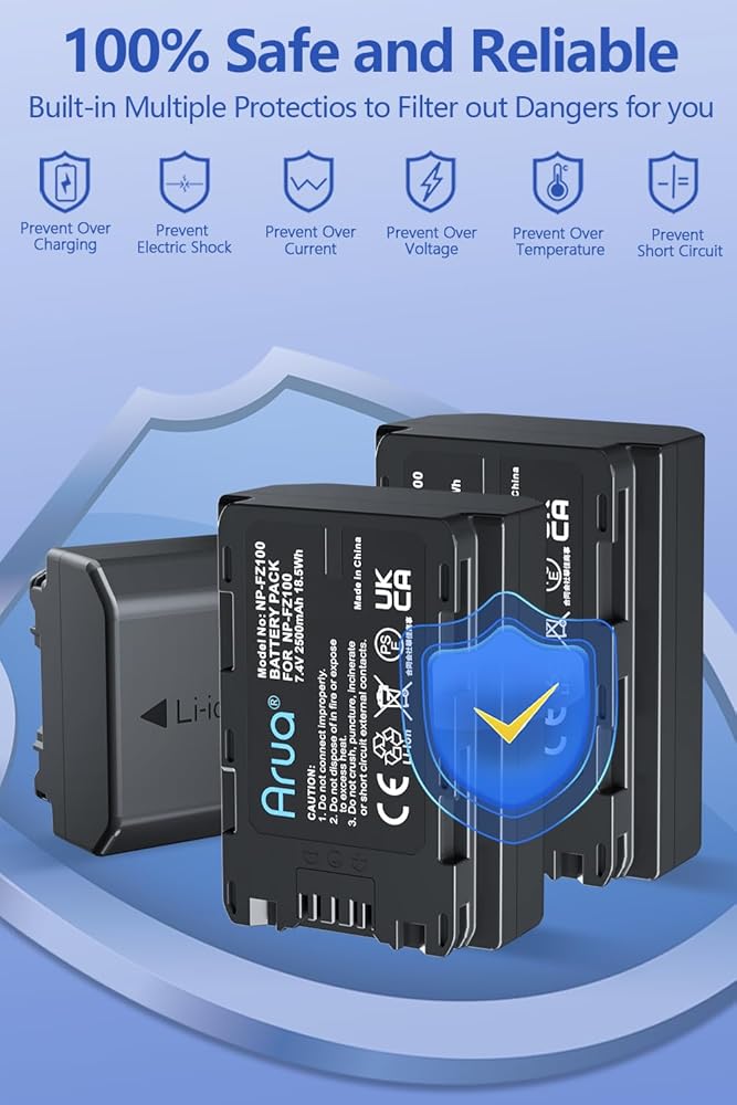 Multiple Safety protections: The Arua NP FZ100 battery has a built in smart chip, which provides overvoltage protection, overcurrent protection, short circuit protection, high temperature, and overcharge protection for your camera