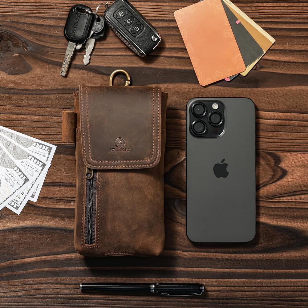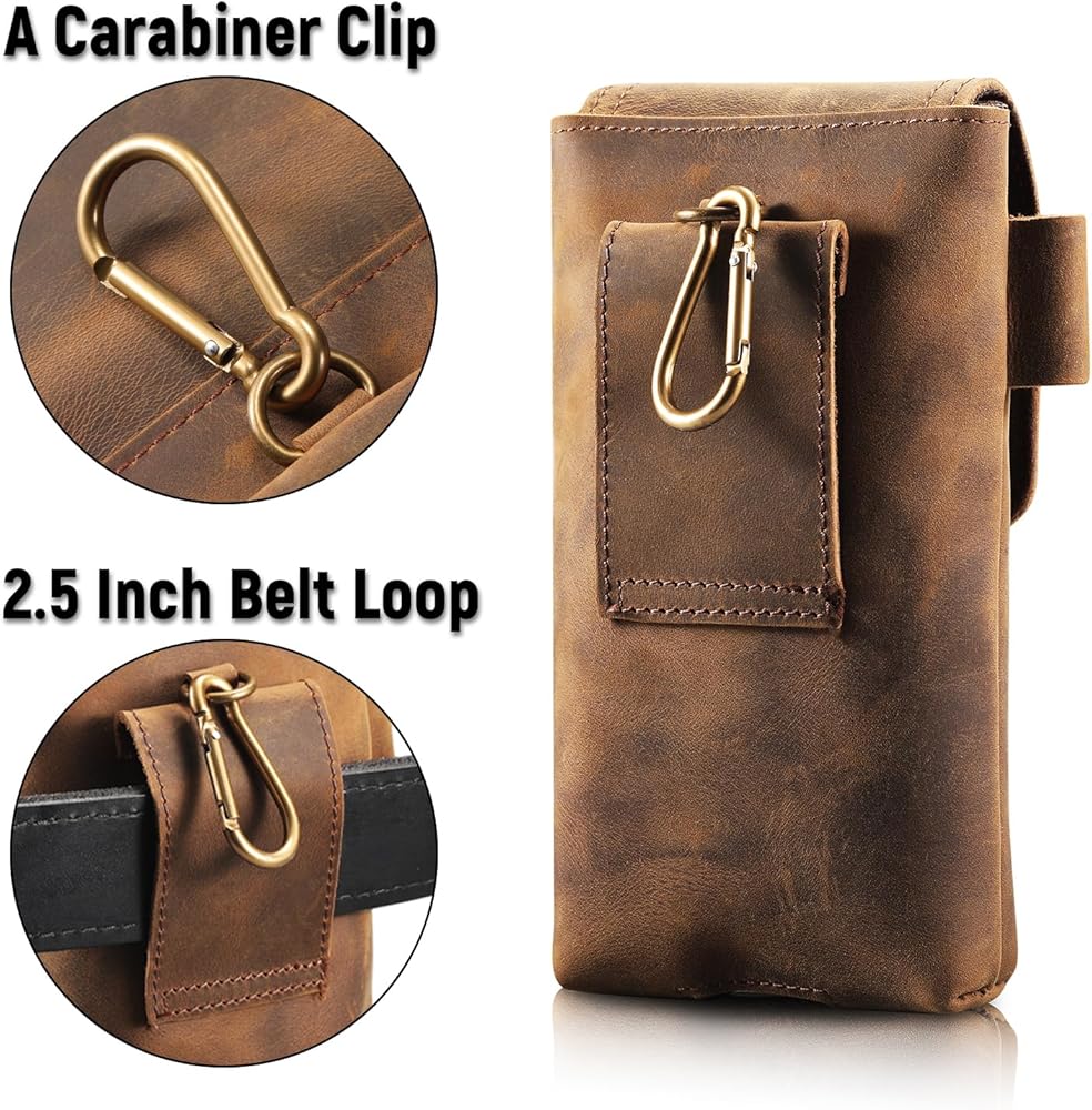Kosibate Leather Phone Holster, Genuine Leather Cell Phone Holster Pouch with Belt Loop and Carabinier for Men, Compatible with iPhone, Samsung Galaxy Large Smartphones
