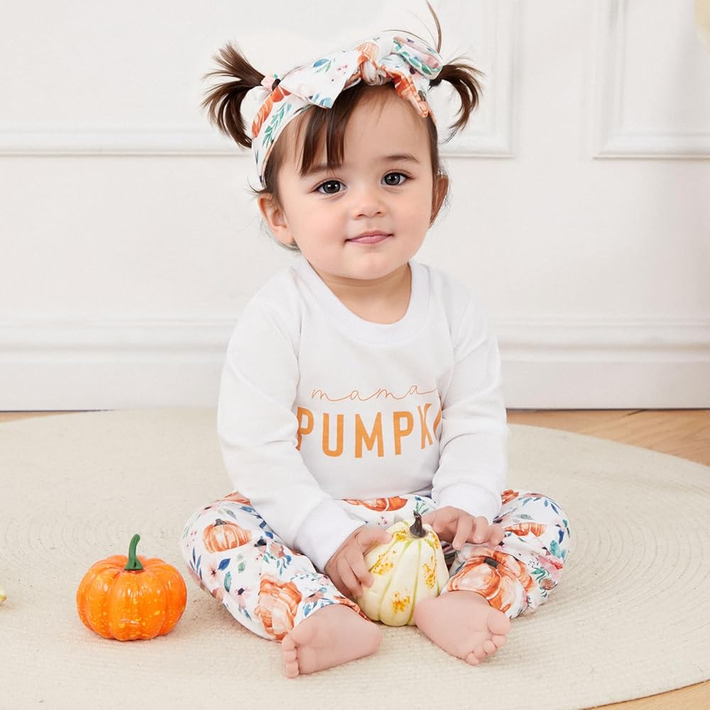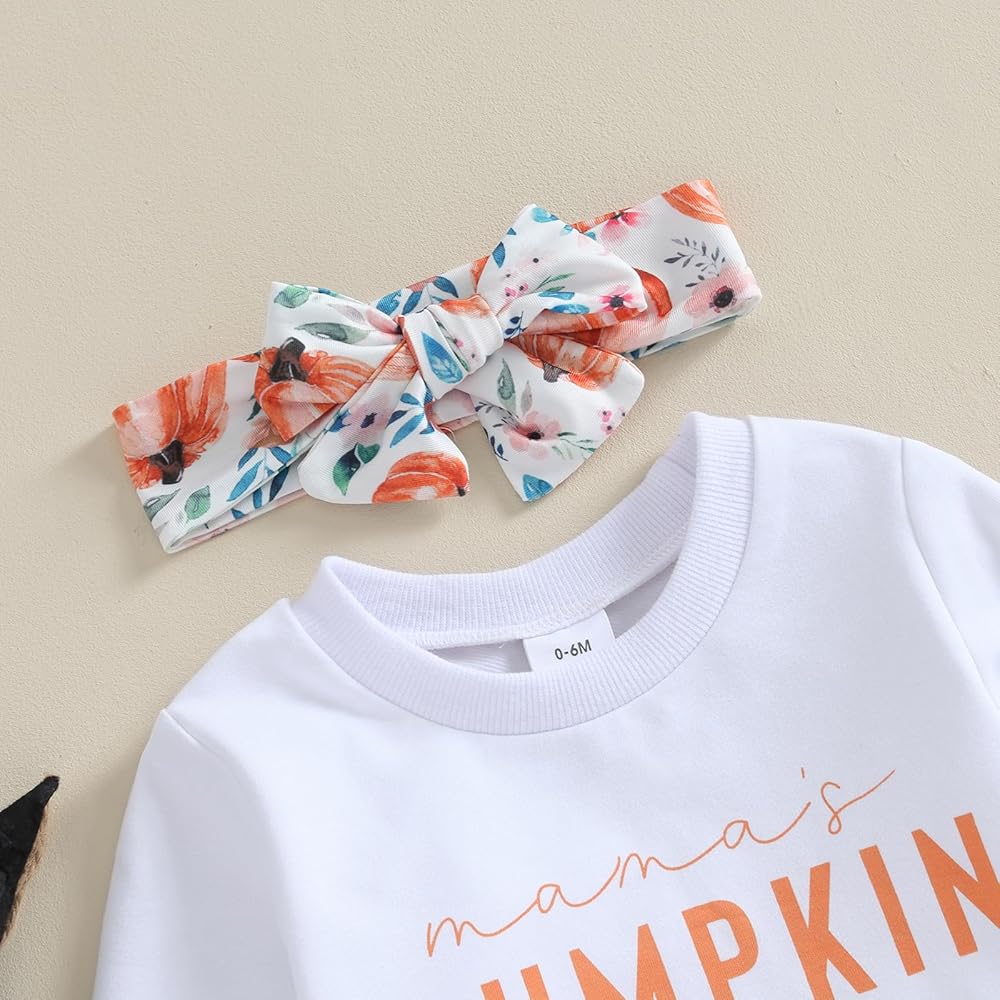 DESIGNS: Thanksgiving clothes for baby, long sleeve, little pumpkin, mama's pumpkin letter print, crew neck sweatshirts, matching with pumpkin flower print elastic waist pants and headband, bright colors make the baby look cute and lovely.