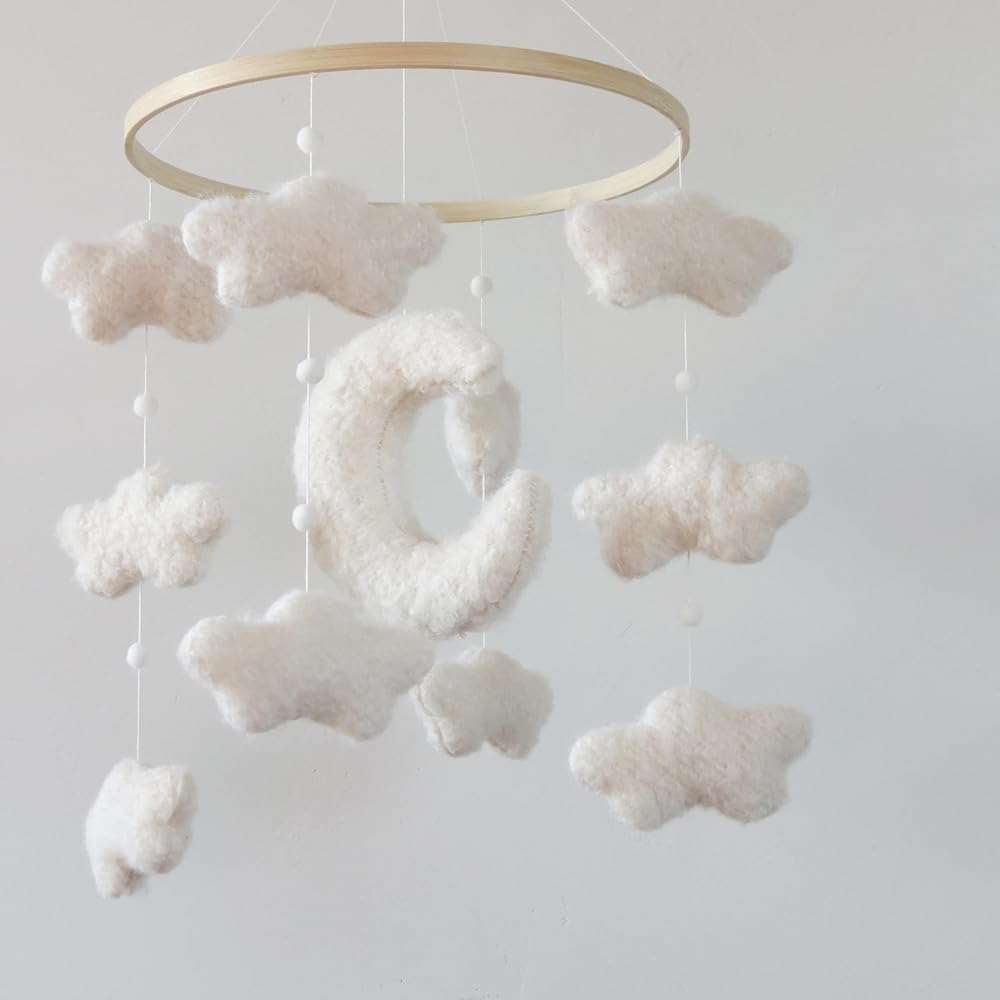 Cloud Moon Crib Mobile Cloud Baby Mobile for Crib Neutral Boho Clouds and Stars Moon Mobile Boucle Mobile.This Boucle Cloud Mobile Harmoniously Combines a White Clouds Moon and Stars. Simple Neutral Tone It'S Completely Neutral Mobile is Suitable for Both Boys and Girls. The Neutral Tones of White, Cream, Light coffee color and Wood Perfectly Complement Any Nursery or Boho Decor.