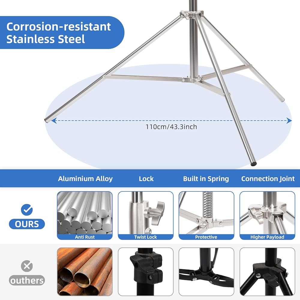 【Durable Material】The photography light stand is made of strong stainless steel, making it corrosion-resistant for long-lasting and strong for heavy duty work. With the guarantee of sturdiness. We replaced the parts (knobs) that didn't need metal with plastic to reduce the weight of the light frame. It's more convenient to carry.