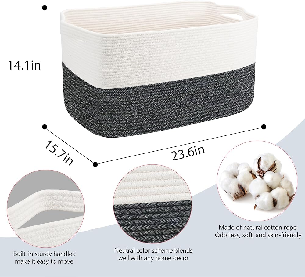 MULTI-FUNCTIONAL BASKETS FOR STORAGE: The rope toy organizer, adorned with a black stripe/ cream white neutral color scheme, seamlessly integrate with your decor. Its beauty appearance makes them suitable for storing a variety of items from blankets to kids stuffed animal toys, towels to baby products, shoes to laundry. This rectangle storage bin will make nursery storage and kids room storage more easier.
