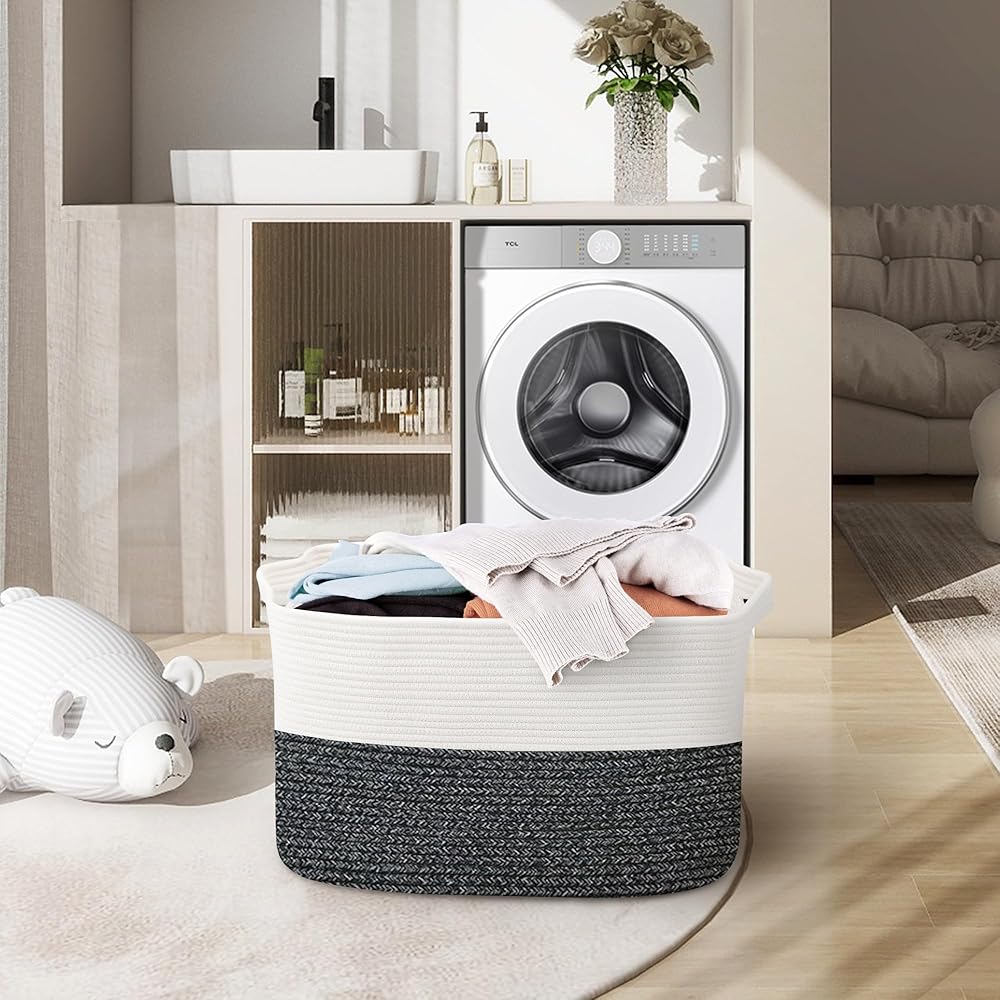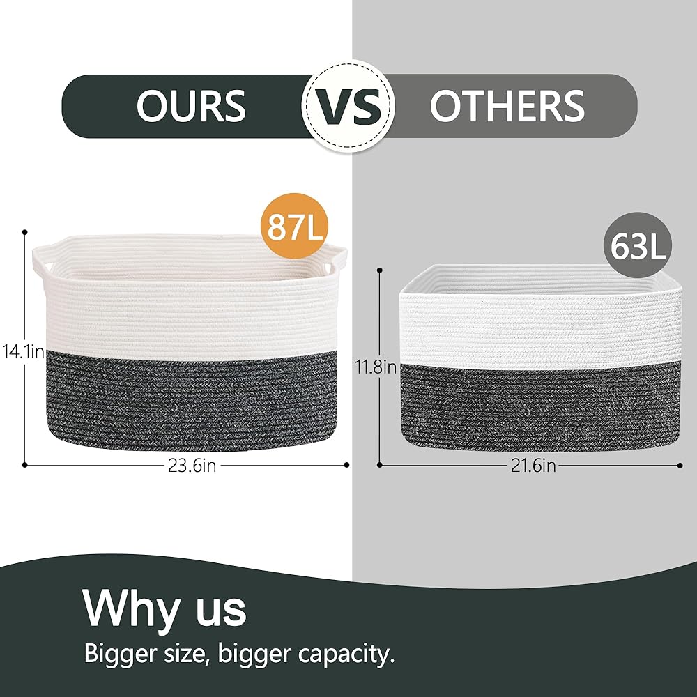 SOFT COTTON ROPE BASKET: This toy storage bins is crafted from handwoven natural cotton rope. The rope material is not only tough but also gentle, ensuring a soft and safe environment for babies, kids, and even pets like dogs and cats.This large large woven fabric basket for storage is free from chemical odors and sharp edges. Keep your floors and walls free of collision scratches.