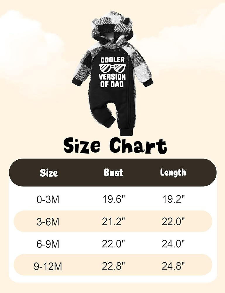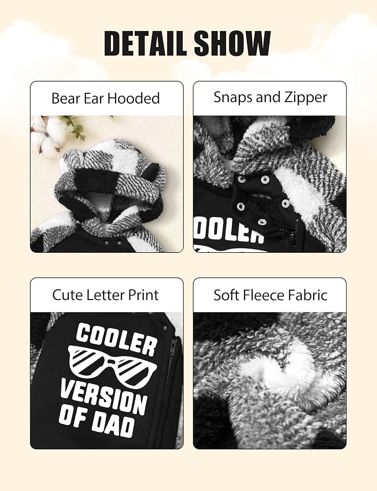 🧸🧸【Unique Design】: Features classic plaid print design, a cute saying ‘Cooler Version of Dad' letter print on the front which is unique and eye-catching, lovely bear ears on the hood making this baby snow suit more stylish and adorable. Attentive full-open zipper design, easy to put on and take off, snaps at edge of hood protect the baby's neck and windproof. Elastic cuffs fit the wrist, keeping warm and comfortable to wear.