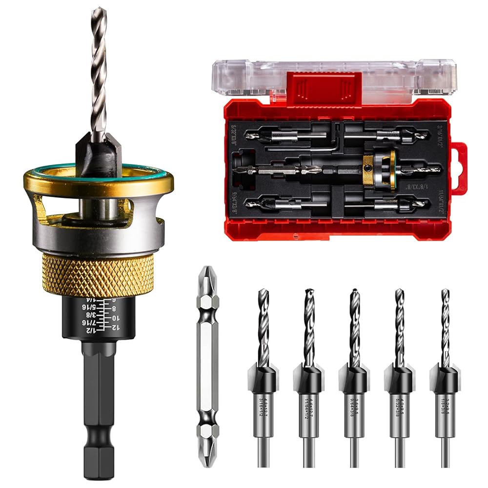Countersink Drill Bit Set for Wood,7 PCS Counter Sink Drill Bit with HSS Tapered Drill Bits and 1/4" Hex Shank Quick Change for Woodworking with Storage Box