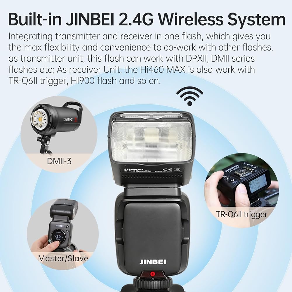 【Built-in JINBEI 2.4G wireless system】Integrating the transmitter and receiver in one flash offers you maximum flexibility and convenience in working with other flashes. As a transmitter, the flash can be used with EF-80, DMII and other flashes; as a receiver, Hi460 MAX can also be used with TR-Q7II, TR-Q6II triggers, HD-1, HD-2, HI900 flashes and so on.