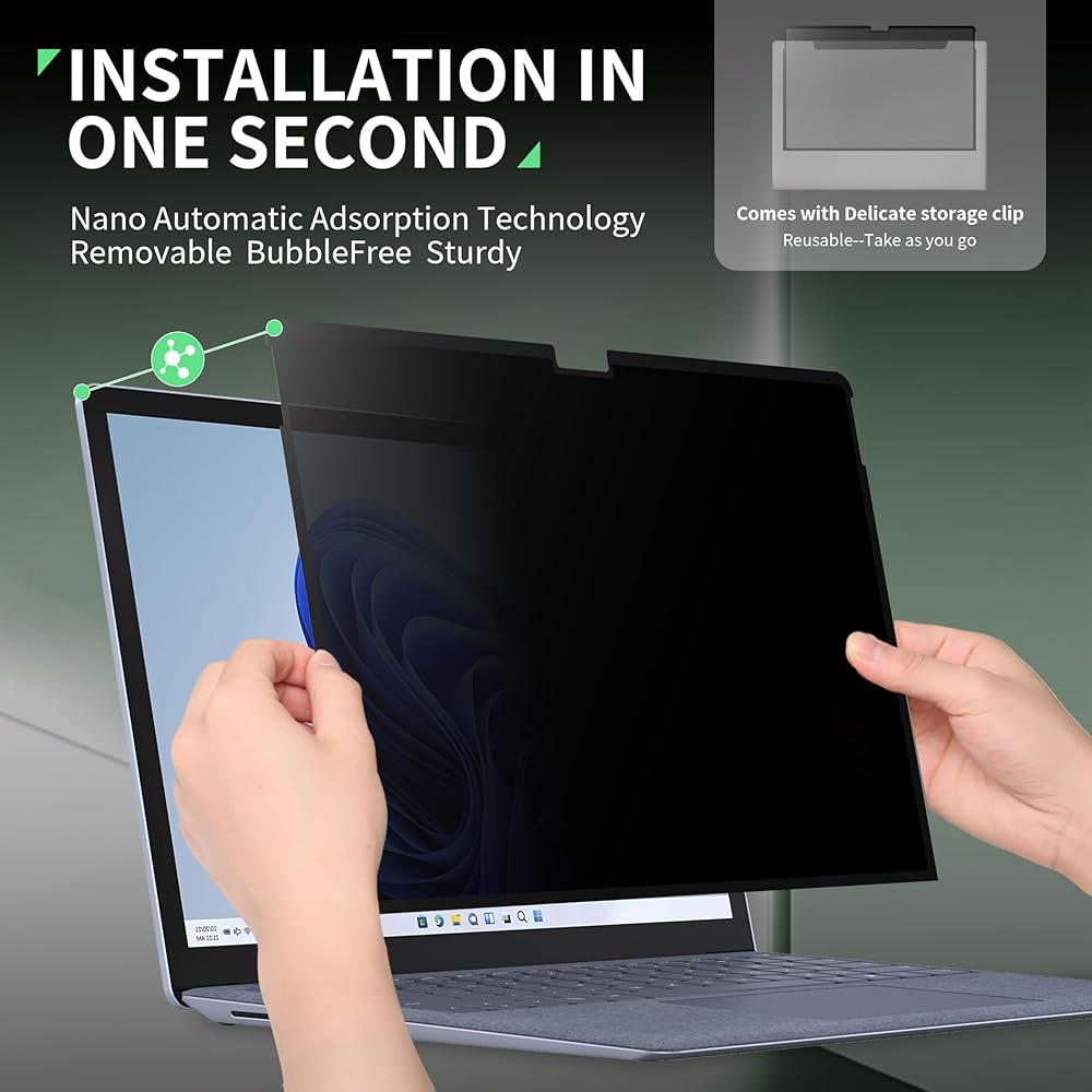 【REMOVABLE & REUSABLE】Our 15'' laptop screen privacy shield has Nano adsorption strips on all sides. Simply align it with the screen bezel, press it gently, and you're ready to go! If you want to take it off it's also easy, just peel it off, no tools needed, no bubbles, no glue residue. What's even sweeter is that it comes with a delicate storage clip, which can keep the anti-spy screen film well when you take it off