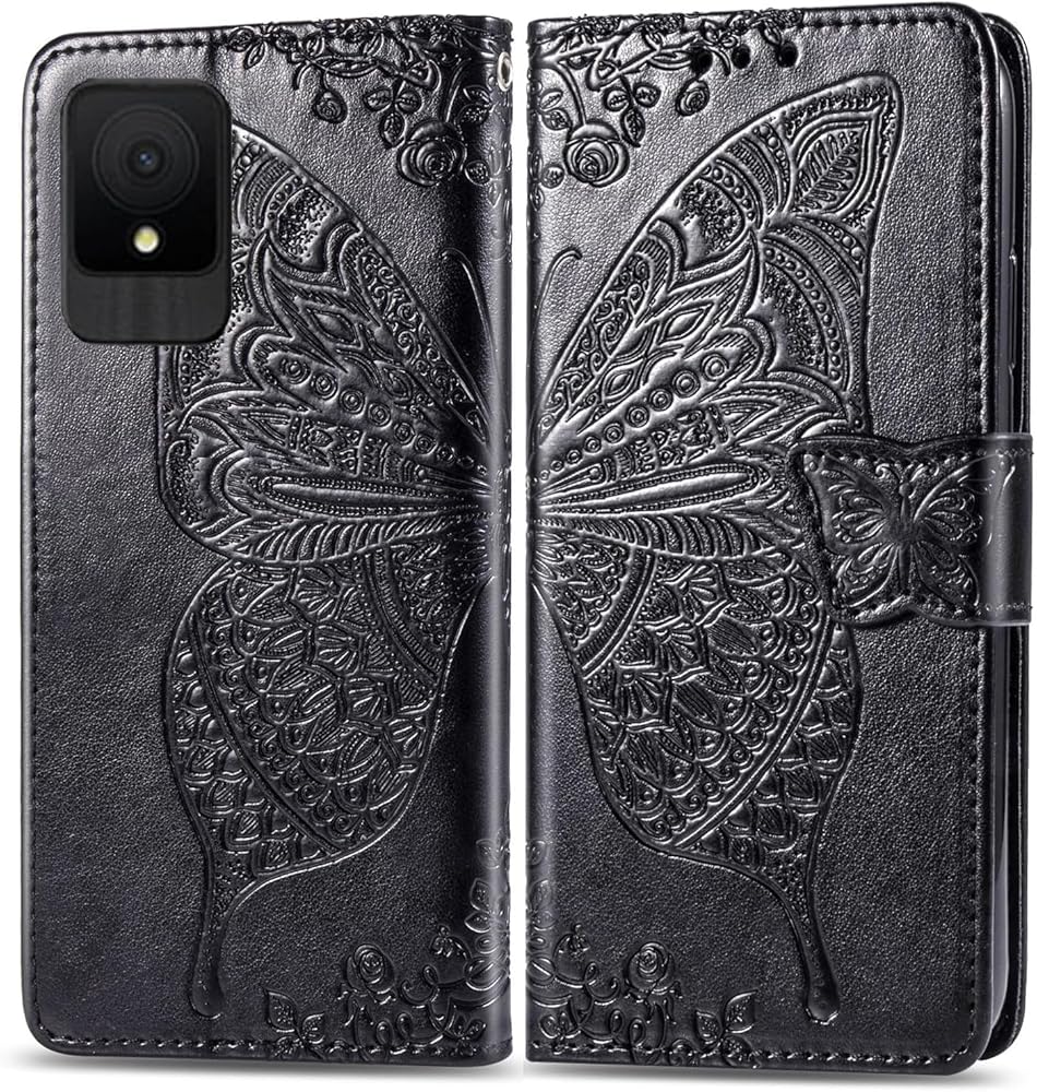 for TCL K11 T432W Case Wallet PU Leather Credit Card Holder Full Body Cute Butterfly Design with Wrist Strap Soft TPU Bumper Full Body Protective Phone Case for Girls Women Black