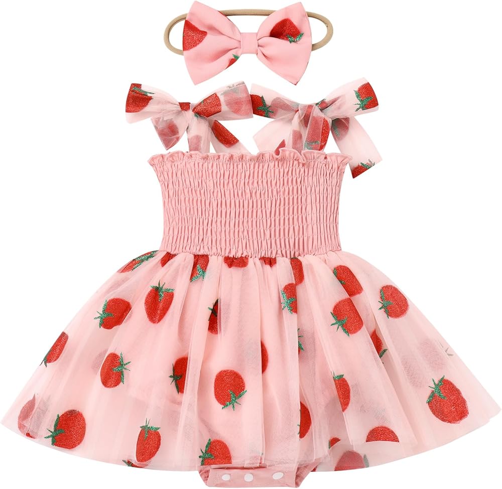 One Romper dresses for baby girl: Infant toddler 1st birthday outfit matching with one year old princess birthday bow tie headband birthday party supplies. The spaghetti straps can be tied two bowknots at shoulders and adjusted the tightness for the fit, half first birthday outfit girl, one year old birthday outfit girl, birthday dress for baby 1 year old girl, 1st birthday outfit girl, baby boho outfit girl, Summer bohemian one year old dresses for newborn baby Easter dresses,