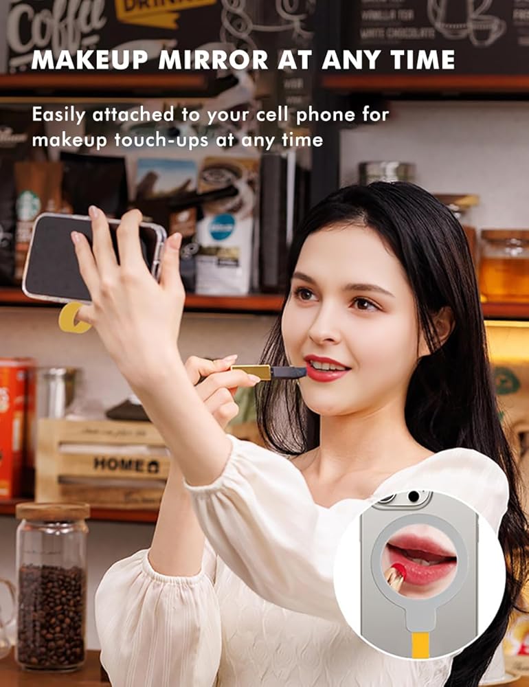 【PRACTICALITY】Magnetic Makeup Mirror for Phone provide the perfect solution for stunning selfies, live broadcasts, video blogs and makeup, presenting the best condition before selfies or video calls! 1: 1. Realistic rendering of makeup details without distortion of realism.